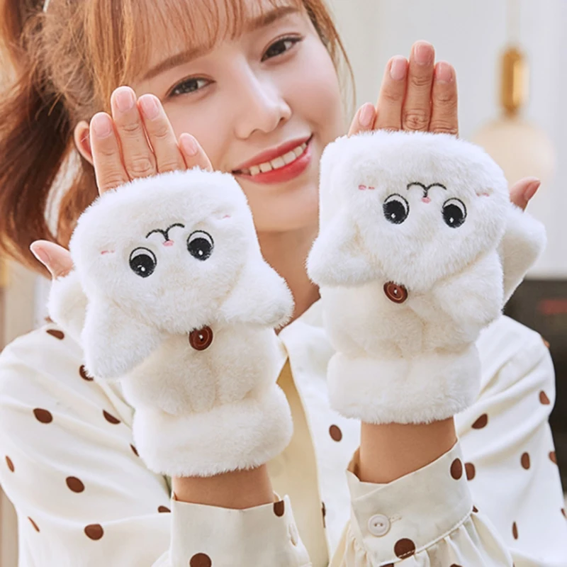 Женские Мультяшные милые зимние плотные теплые перчатки из кроличьего меха теплые перчатки без пальцев с запястьями перчатки варежки рождественские подарки для девочек