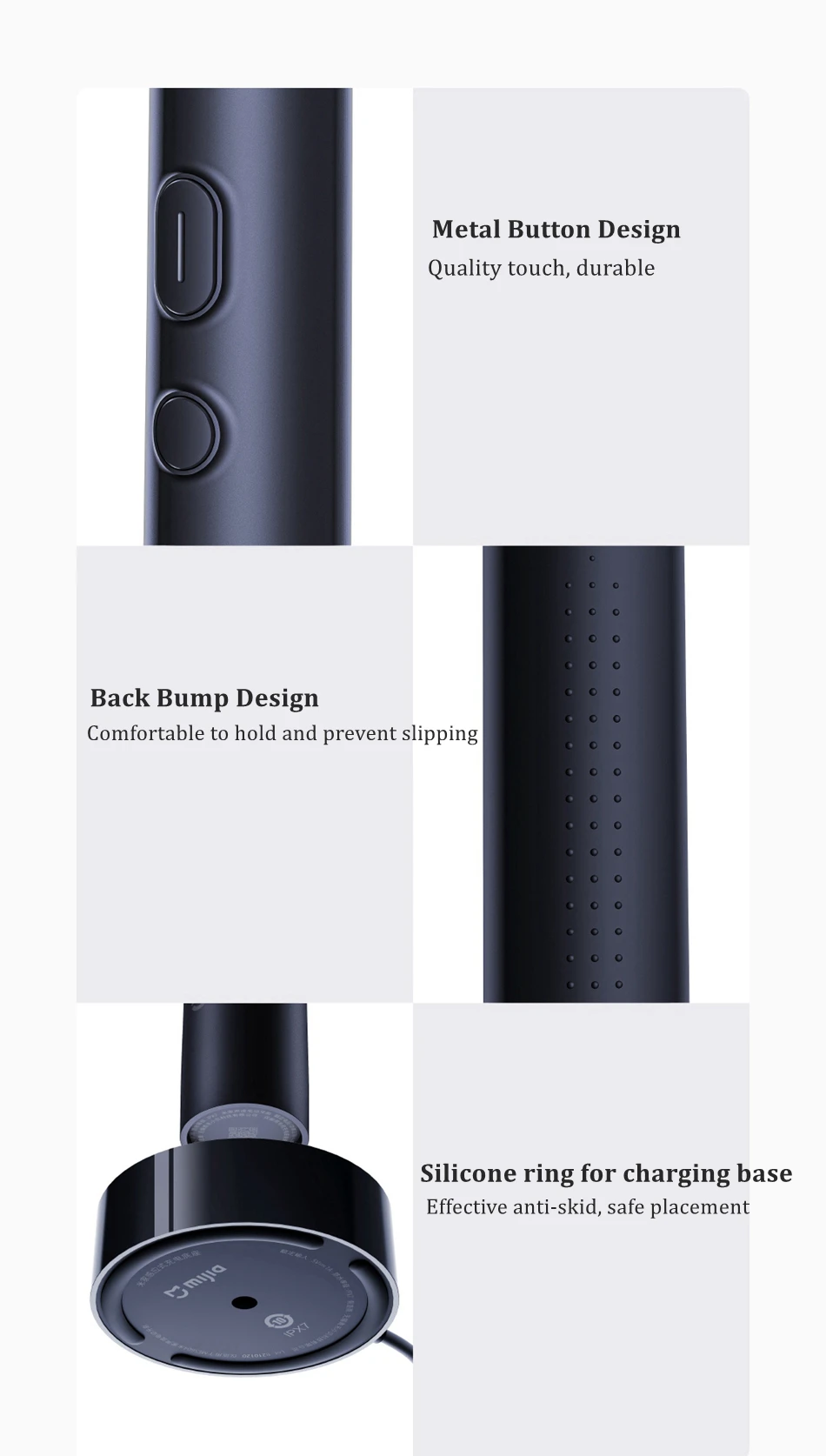 【Металлическая Кнопка дизайна 】 качественный сенсорный, прочный; 【Дизайн задней скобы 】удобно держать и предотвращать скольжение; 【Силиконовое кольцо для зарядки 】 эффективное противоскользящее, безопасное размещение.