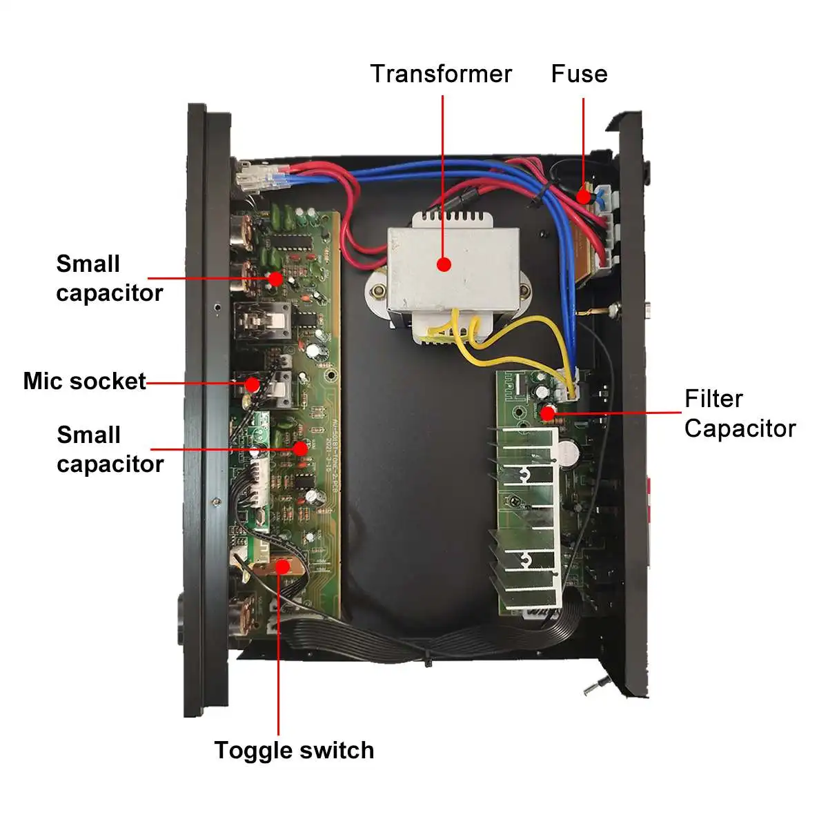 -Полнофункциональный, с bluetooth 5,0, с fm-радио, с светодиодный дисплеем, с входом DC12V, с 4 входами микрофона, с ревербецией микрофона и регулировкой задержки, поставляется с 5-полосным эквалайзером смеситель функция.