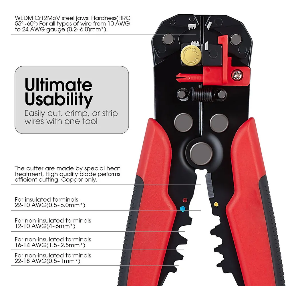 Характеристика: 【 Self-Adjusting】Comes с саморегулирующимся челюсти идеально подходит для 10-21 AWG 0,2-6mm м² провода. 3 в 1 провод для зачистки используется для Зачистка проводов, машина для резки и опрессовки, очень подходит для промышленного и ежедневного использования. 【 Многофункциональность 3 в 1 Используйте этот инструмент для зачистки проводов, чтобы быстро и эффективно стричь, вырезать и обжимать, экономя время и усилия. Он обеспечивает диапазон резки между 10-21 AWG 0,2-6 мм ². 【Удобный захват обеспечивает максимальный комфорт на ручке и уменьшает усталость рук. Пластиковая ручка обеспечивает максимальное давление и больший комфорт, обеспечивая автоматическую регулировку рукоятки. 【Высокое качество 】стальная конструкция A3 с отличными плоскогубцами прочны и достаточно прочны, чтобы справиться даже с самыми сложными задачками. [Широкое применение] этот продукт в основном используется для проводов, кабелей, композитных кабелей, многожильных композитных кабелей, металлических кабелей и т. д. и может быть широко использован в регулировке и обслуживании кабелей для бытовой техники, осветительное оборудование и т. Д.