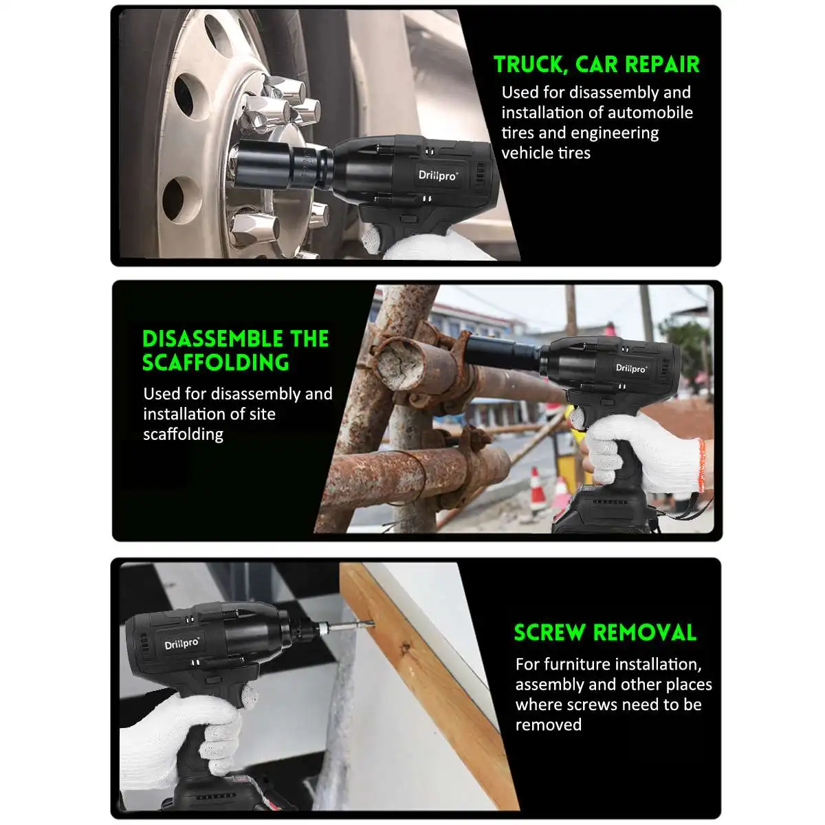 Особенности-Бесщеточный двигатель.-Светодиодный индикатор работы.-Большой крутящий момент используется для грузовых шин.-Большой крутящий момент, разборка шин, легко справиться.-800N.M высокий крутящий момент, плавный Переключатель изменения скорости.-Мощный электрический гаечный ключ, многоцелевой, супер мощный.-Вал из вольфрамовой стали, высокая твердость и износостойкость.-Подходит для строительных площадок, технического обслуживания, деревообработки и т. Д.-Переключатель вперед/назад/замок, поддержка движения вперед/назад и безопасная блокировка.