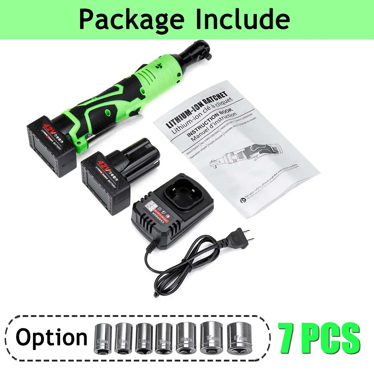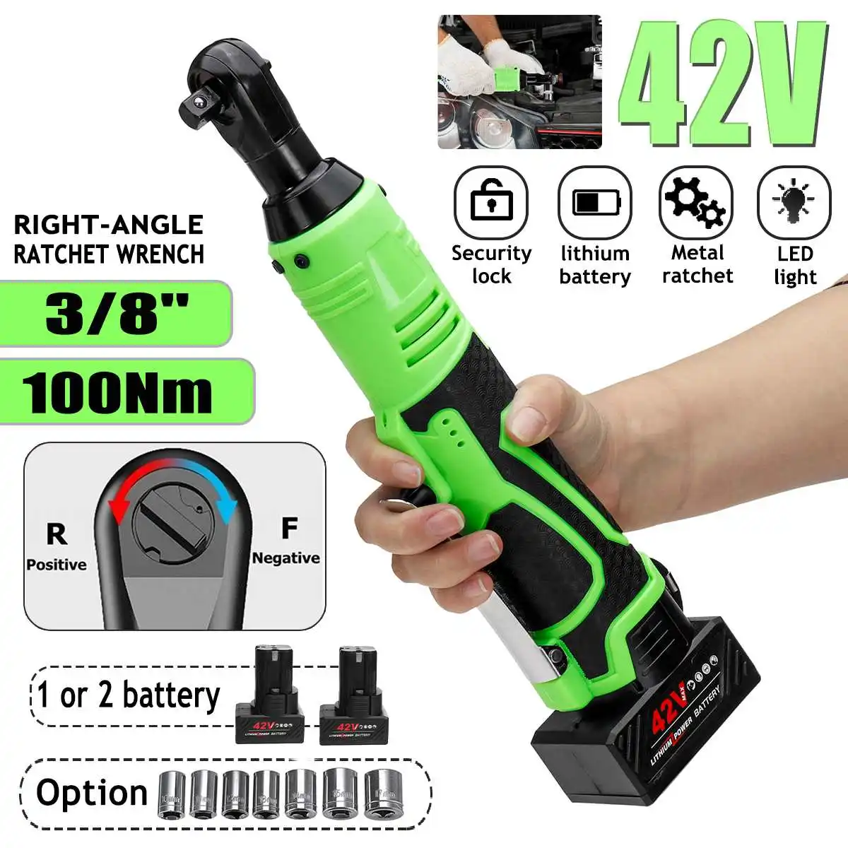 Особенности:-100 нм большая система крутящего момента, высокая скорость, мощная мощность и эффективная защита от повреждений машины, вызванных чрезмерной температурой двигателя.-R/F положительный и отрицательный дизайн. R/F положительный и отрицательный дизайн, легко разбирается.-Батарея lith ium большой емкости, легкая зарядка и длительный срок службы батареи.-3/8 "квадратная головка, 3/8 марганцевая стальная шпиндель. Металлические шарики точно зажимаются, и рукав можно снять без снятия.-Ширина носа 3 см. Ширина носа составляет всего 3 см, подходит для небольшого пространства, электрического предварительного затягивания и ручного армирования.-Светодиодный рабочий светильник дизайн. Светодиодный рабочий светильник автоматически светильник s во время работы, что делает его легко работать в темное время суток-Широкий спектр применения. Установка ферменной конструкции, строительство свадебной сцены, ремонт автомобилей, механическое обслуживание.Характеристики:Название: гаечный ключ с прямым угломЦвет: зеленый + черныйНапряжение зарядки: Универсальное напряжениеМаксимальный крутящий момент: 100 Н. МНапряжение батареи: 42 вРазмер головки: 3/8 "(10 мм)Угол: 90 °Размер изделия: 310x70ммИспользование: установка ферменной конструкции, сценическая конструкция, ремонт автомобилейПосылка включает в себя:1 х Трещоточный ключ с прямым угломЗарядное устройство-1 шт.7 x Набор розеток (10 мм 11 мм 12 мм 13 мм 14 мм 15 мм 17 мм) (опционально)1 или 2 литий-ионных аккумулятора (опционально)1 x Руководство пользователя