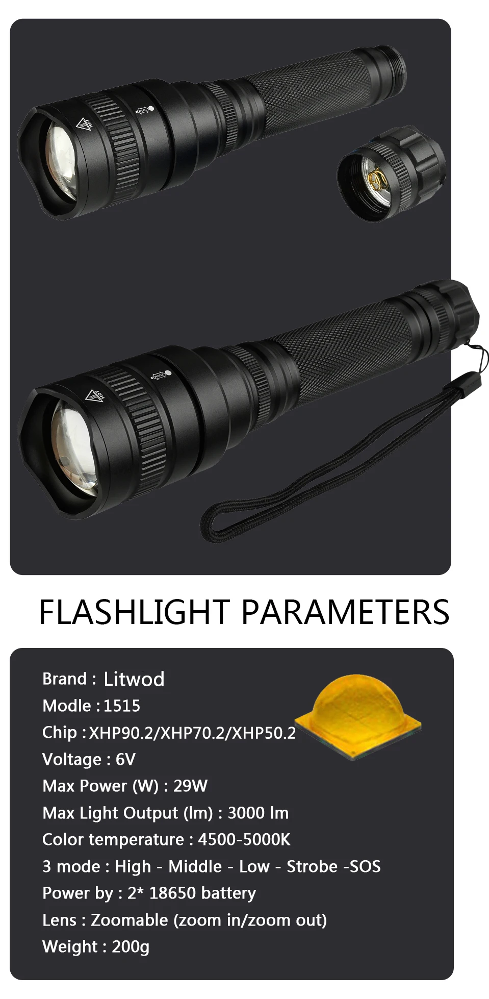 1. Название бренда: Litwod2. Название модели: 15153. Количество: 1 шт.4. Бусины: CREE-XHP90.25,5 -Режимы: 100% - 70% - 50%-стробоскоп-SOS