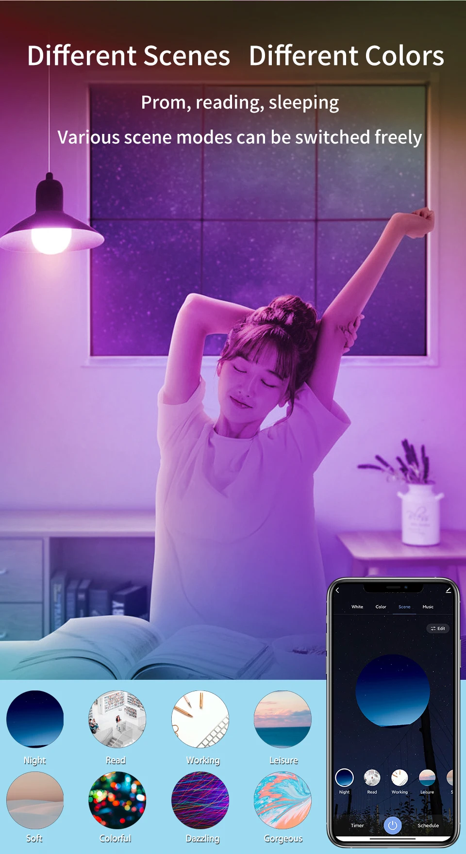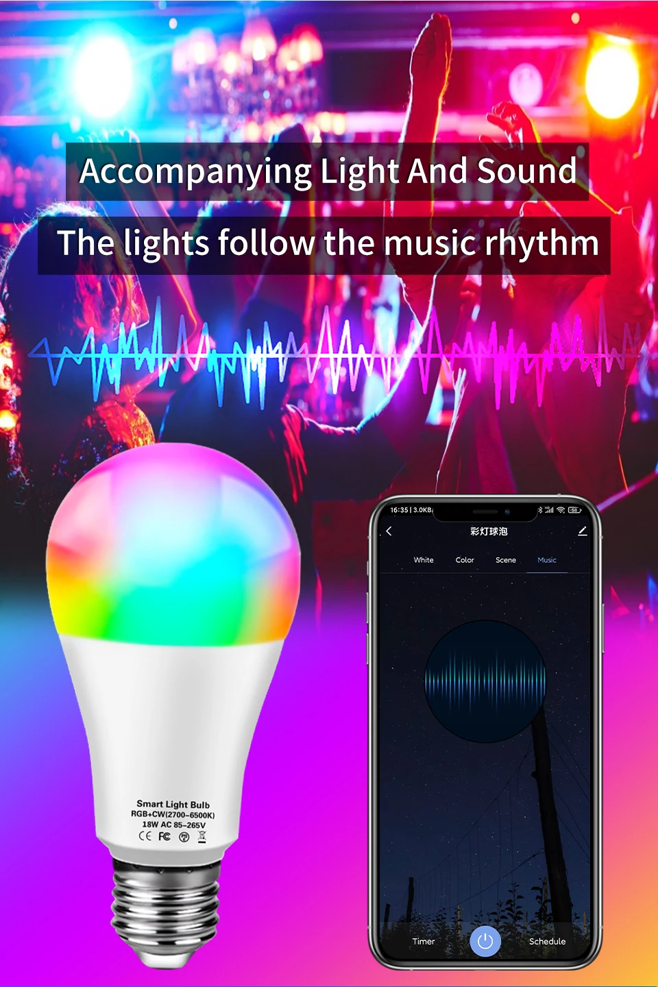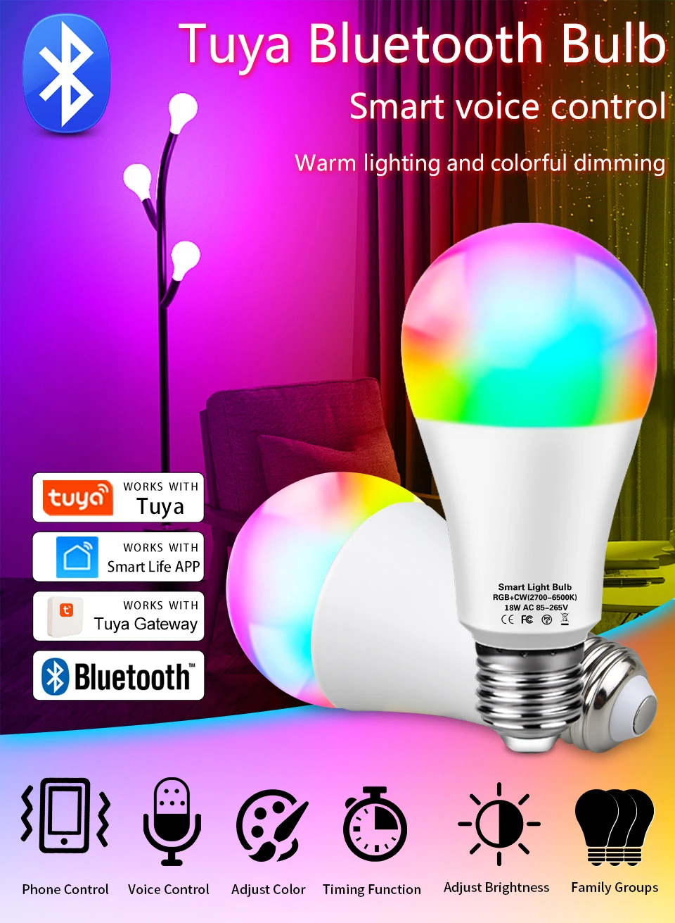 Примечание (очень важно):Это Bluetooth лампочка, нужно только напрямую подключить к телефону bluetooth. Он не может подключаться к alexa или другому устройству wifi, если вы хотите обновить эту лампу Bluetooth в лампу WiFi, вам нужен шлюз Tuya.Характеристики:Название продукта: лампа Tuya Bluetooth RGBТип гнезда: E27Цветовая температура: RGB + теплый белый + холодный белыйНапряжение: AC85-265VМощность: 12 Вт 15 Вт 18 ВтНазвание приложения: Tuya/Smart LifeFreatures:1) Дистанционное управление с помощью приложения: Tuya Smart APP/Smart Life APP можно использовать для удаленного управления включением и выключением лампы. Меняйте цвет на светильник, яркость и т. д.2) может быть лампочка Wi-Fi работает с шлюзом Tuya: лампочка Bluetooth может быть лампочкой WiFi после работы с шлюзом Tuya, после обновления лампа совместима с Alexa и Google Home Assistant, позволяет использовать интеллектуальную лампу голосового управления для включения/выключения.3) Время: лампа автоматически включается и выключается в данный момент времени через функцию таймера.4) функция совместного использования: можно поделиться с семьей.5) Красочные: 16 миллионов цветов для вас, чтобы выбрать и сделать вашу жизнь яркой. Отрегулируйте цветовую температуру от 2700-6500K, сделайте светильник, который вы хотите.6) Синхронизация музыки: яркость освещения может быть изменена в синхронизации с ритмом вашей любимой музыки, создавая расслабляющую и спокойную атмосферу. Замените любую комнату на танцпол или создайте спокойную и спокойную атмосферу. Таких как гостиная, кухня, спальня и так далее.7) групповое управление: Управляйте всеми огнями одновременно, создавая группы и добавляя свои огни в вашу группу.