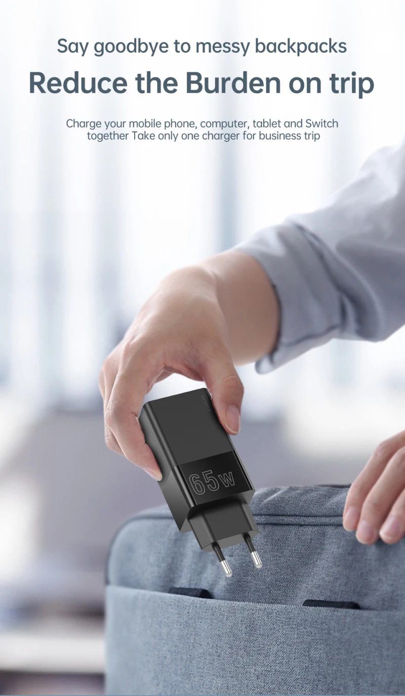 Третье поколение полупроводниковых материалов black technology GaN-это новый тип полупроводникового материала, широко используемый в аэрокосмической и военной областях. Благодаря высокой теплопроводности, высокой термостойкости, кислоте и щелочности зарядное устройство может не только достичь небольшого размера и веса, но и светильник, но также имеет преимущества в преобразовании мощности зарядки с таким же зарядным устройством (не-GaN).Он может быстро поставляет питание для высокопроизводительных устройств, таких как MacBook и ThinkPad, делая офисные легче около 2 часов 15,4 дюймов MacBook ProПоддержка протокола быстрой зарядки PD 3,0 PD2.0 PPS QC4.0 QC3.0 QC2.0 FCP SCP AFC MTK поддержка протокола быстрой зарядки большинства мобильных телефонов на рынкеUSB-A C Зарядное устройство Вход Напряжение: AC100-240V 50/60Hz Выходное напряжение Напряжение: USB-C 5V3A/9V3A/12V3A/15В/3A/20V3.25A(65 Вт) USB-A 3,6-6,5 V/3A, 6,5-9 В/2A, 12 В/1.5A(20 Вт) двойной порт Выход: USB-C(45 Вт) USB-A(20 Вт)Может быстро обеспечить питание базы переключателя, подключиться к телевизору и играть в игрыНе повреждает встроенный чип протокола PD сертификации телефона, чип управления питанием, синхронный чип выпрямления. Несколько гарантий более надежныБыстрая зарядка при низкой температуре с использованием высокопроизводительных трансформаторов, MOS трубок, конденсаторов и других компонентов, высокая энергоэффективность коэффициент конверсии Низкая потеря, не легко получить горячий после зарядкиУменьшить нагрузку на Попрощайтесь с грязными рюкзаками зарядите свой мобильный телефон, компьютер, планшет и переключитесь вместе, Установите только одно зарядное устройство для деловой поездкиМодный внешний вид прочный и прочный корпус из поликарбоната, с использованием технологии сращивания, модный и прочныйСертификация качества прошла серию сертификатов качества, таких как CE, FCC, RoHS и т. д., чтобы дать вам больше спокойствия.
