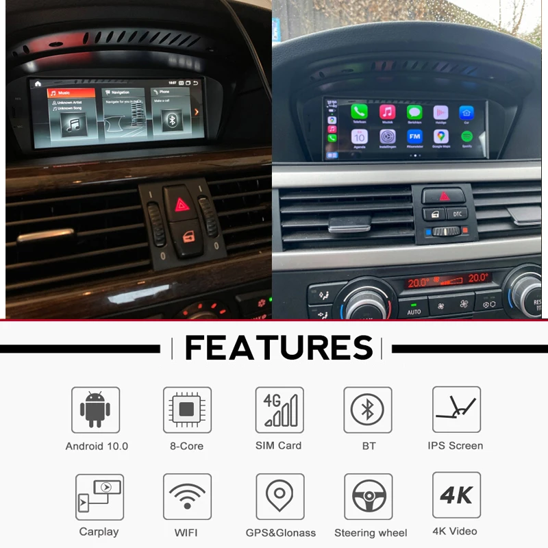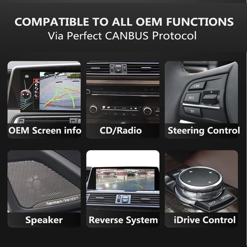 ● Поддержка Mirrorlink - Android и IOS и беспроводной CarPlay встроенный● Встроенный высокочувствительный GPS.● Встроенный WIFI, поддержка 3D карты• Поддержка Multi Touch.● Встроенный BMW Canbus, поддержка iDrive.● Поддержка управления рулем.● Поддержка оригинальной информации о автомобиле.● Звук GPS выводится из переднего левого динамика.● Совместимость с оригинальным экраном 6,5/8,8/10,25 дюйма.● Совместим с/без оптического волокна.● Совместимость с/без оригинальной навигации● Поддержка оригинальных всех функций.• Поддержка Оригинальное автомобильное радио.● Встроенный Bluetooth и поддержка оригинального Bluetooth.● Поддержка Idrive управления в меню Android.● Поддержка Idrive управления в оригинальном меню.● Поддержка оригинальной/послепродажной камеры.● Поддержка траектории парковки/радара.● Поддержка AUX переключатель автоматически-некоторые старые автомобили переключаются вручную