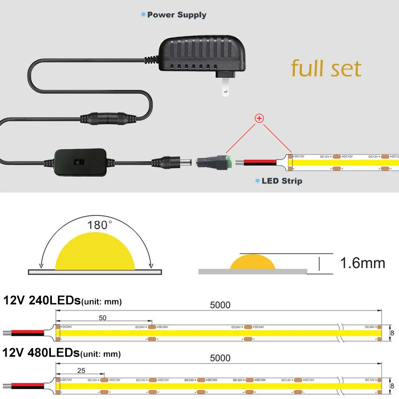Спецификация:Мощность Вход: 100 ~ 240V 50/60HzВыходная мощность: 240 светодиодов/m-12V2A, 480 светодиодов/m-12V3A.Ширина печатной платы: 240 светодиодов/m-8mm, 480 светодиодов/m-8mm.Количество СВЕТОДИОДНЫЙ: 240 светодиодный s/m, 480 светодиодный s/m.Длина резки: каждые 50 мм (240 светодиодов/м), каждые 25 мм (480 светодиодов/м).Цветовая температура: теплый белый (2700K), теплый белый (3000K), натуральный белый (4000K), холодный белый (6000K).Индекс цветопередачи: Ra>90.Рабочая температура: -20 ℃-+ 45 ℃.Температура хранения: -20 ℃-+ 60 ℃.Угол обзора: 180 °.Посылка:1 × 5 м COB светодиодный ленточный светильник.1 × ручной контроллер датчика развертки.1 × блок питания DC12V.