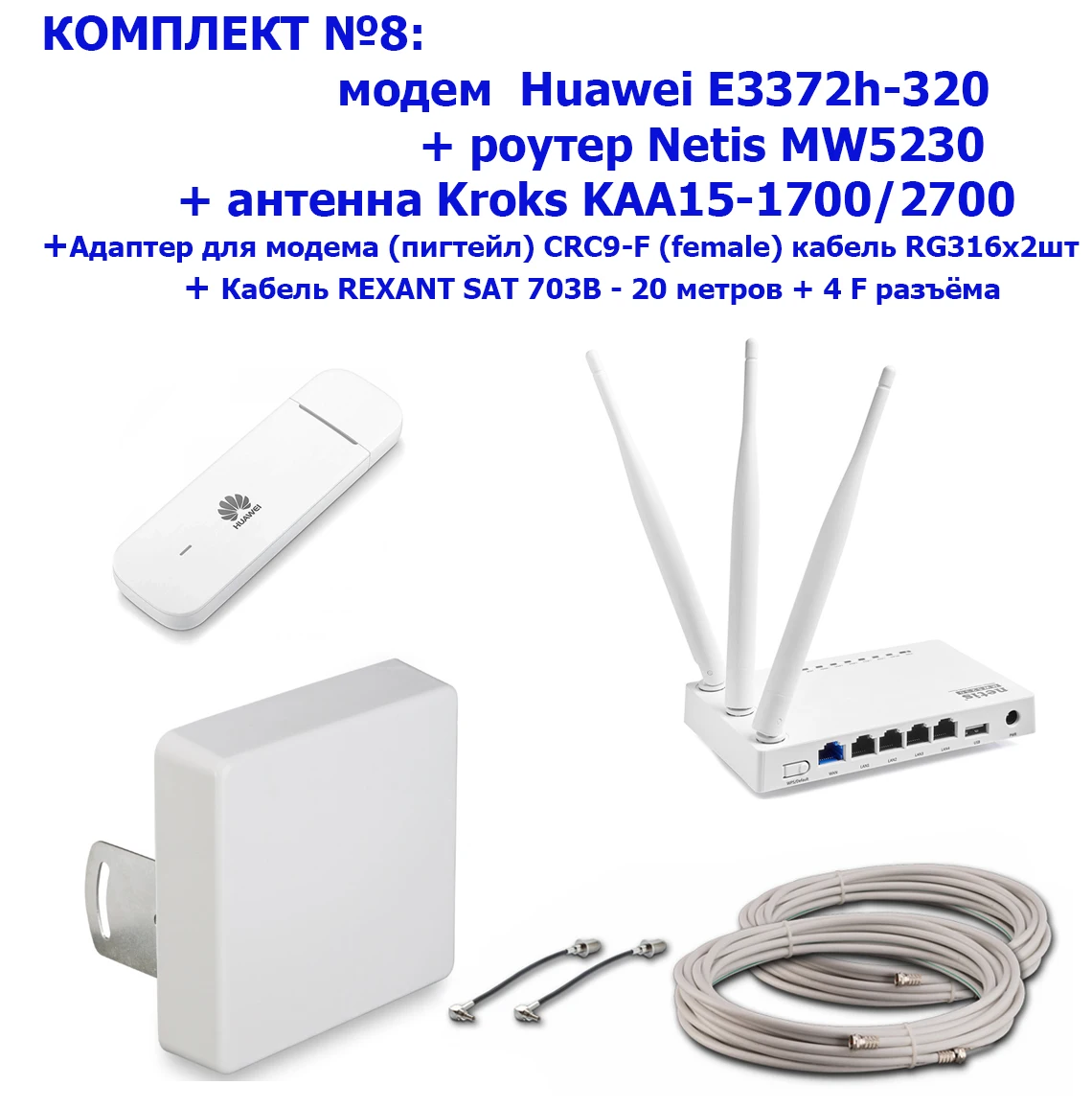 Комплект 2:- Модем Huawei E3372h-320- Роутер Netis MW5230Комплект 3:- Модем Huawei E3372h-320- Роутер Netis MW5230-Антенна Kroks КP15-1700/2700Комплект 4:- Модем Huawei E3372h-320- Роутер Netis MW5230-Антенна Kroks KAA15-1700/2700Комплект 5:- Модем Huawei E3372h-320- Роутер Netis MW5230- Антенна Kroks КP15-1700/2700- Адаптер для модема (пигтейл) CRC9-F (female) кабель RG316Комплект 6:- Модем Huawei E3372h-320- Роутер Netis MW5230- Антенна Kroks KAA15-1700/2700- Адаптер для модема (пигтейл) CRC9-F (female) кабель RG316 x 2 штКомплект 7:- Модем Huawei E3372h-320- Роутер Netis MW5230- Антенна Kroks КP15-1700/2700- Адаптер для модема (пигтейл) CRC9-F (female) кабель RG316 - Кабель REXANT SAT 703B - 10 метров + 2 F разъёмаКомплект 8:- Модем Huawei E3372h-320- Роутер Netis MW5230- Антенна Kroks KAA15-1700/2700- Адаптер для модема (пигтейл) CRC9-F (female) кабель RG316 x 2 шт.- Кабель REXANT SAT 703B - 20 метров + 4 F разъёмаКомплект 9:-Модем Huawei E3372h-320- Роутер Netis MW5230- Антенна Kroks КP15-1700/2700- Адаптер для модема (пигтейл) CRC9-F (female) кабель RG316 - Кабель REXANT SAT 703B - 10 метров + 2 F разъёма- Кронштейн для антенн 150 ммКомплект 10:-Модем Huawei E3372h-320- Роутер Netis MW5230- Антенна Kroks KAA15-1700/2700- Адаптер для модема (пигтейл) CRC9-F (female) кабель RG316 x 2 шт.- Кабель REXANT SAT 703B - 20 метров + 4 F разъёма- Кронштейн для антенн 150 мм
