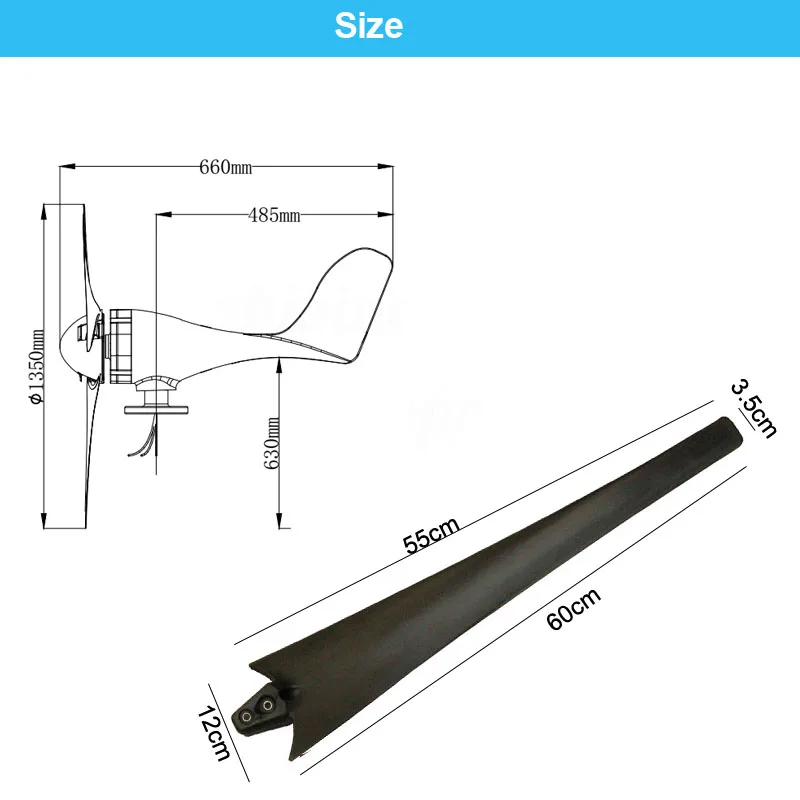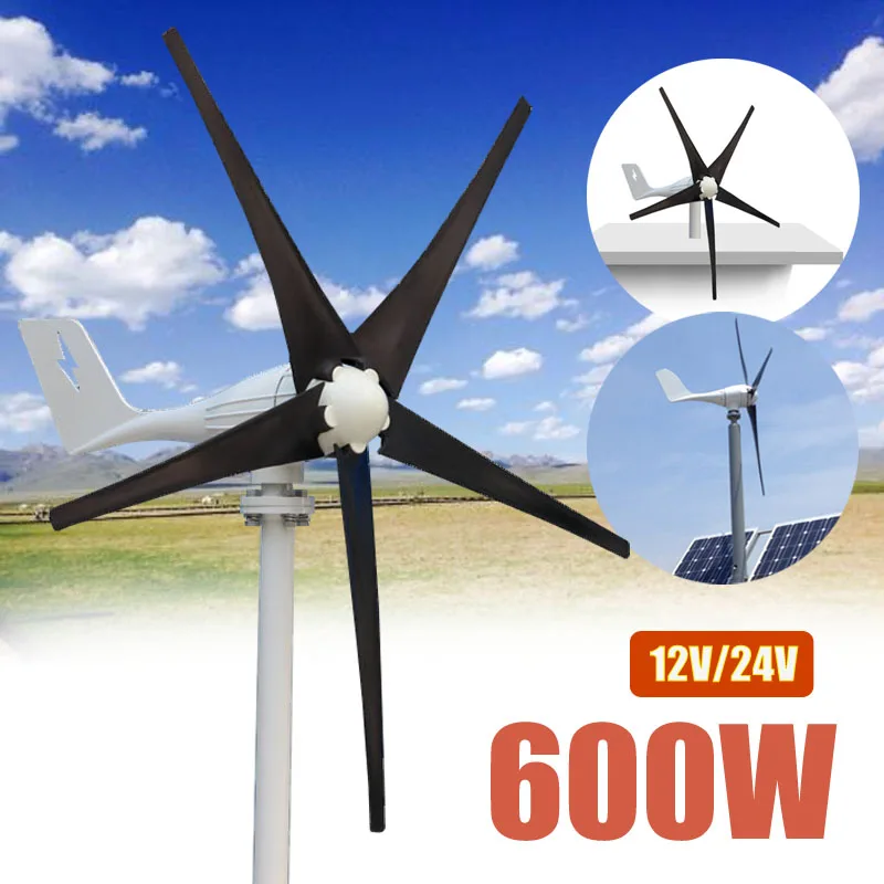 Особенности:-Запуск скорости ветра низкий, высокий коэффициент использования энергии ветра; Небольшой размер, хороший внешний вид, низкая рабочая Вибрация;-Установка удобного дизайна, удобная установка, обслуживание и ремонт оборудования;-Использование интеллектуального управления микропроцессором с высокой мощностью, эффективное регулирование тока и напряжения;-Корпус изготовлен из литья под давлением из алюминиевого сплава с двойным несущим элементом, прочность защиты от тайфунов более высокая, безопасная и надежная работа;-Лезвие ветрового колеса с новой технологией точного литья под давлением в сочетании с оптимизацией конструкции аэродинамической формы и конструкции, высоким коэффициентом использования энергии ветра, увеличением годового производства электроэнергии;-Генератор использует запатентованный генератор с магнитным подшипником в сочетании со специальной конструкцией статора, эффективно снижает крутящий момент генератора, а ветровое колесо и генератор обладают более хорошими соответствующими характеристиками, устройство работает надежно.Характеристики:-Материал листа: нейлоновое волокно-Цвет: белый и черный-Длина лезвия: 600 мм-Диаметр ветрового колеса: 1350 мм-Вес: 8,5 кг-Номинальная мощность: 600 Вт-Номинальное напряжение: в-Начальная скорость ветра: 2,0 м/с-Номинальная скорость ветра: 13 м/с-Безопасная скорость ветра: 50 м/с-Количество листьев: 5 шт.-Метод торможения: электромагнитный-Регулировка направления ветра: автоматическая регулировка ветра-Мощность и тип ветра: трехфазный синхронный генератор постоянного магнита переменного тока-Рабочая температура: -40 ℃ - + 80 ℃Посылка:-1X комплект ветровых турбин (стенты в комплект не входят)-1 руководство