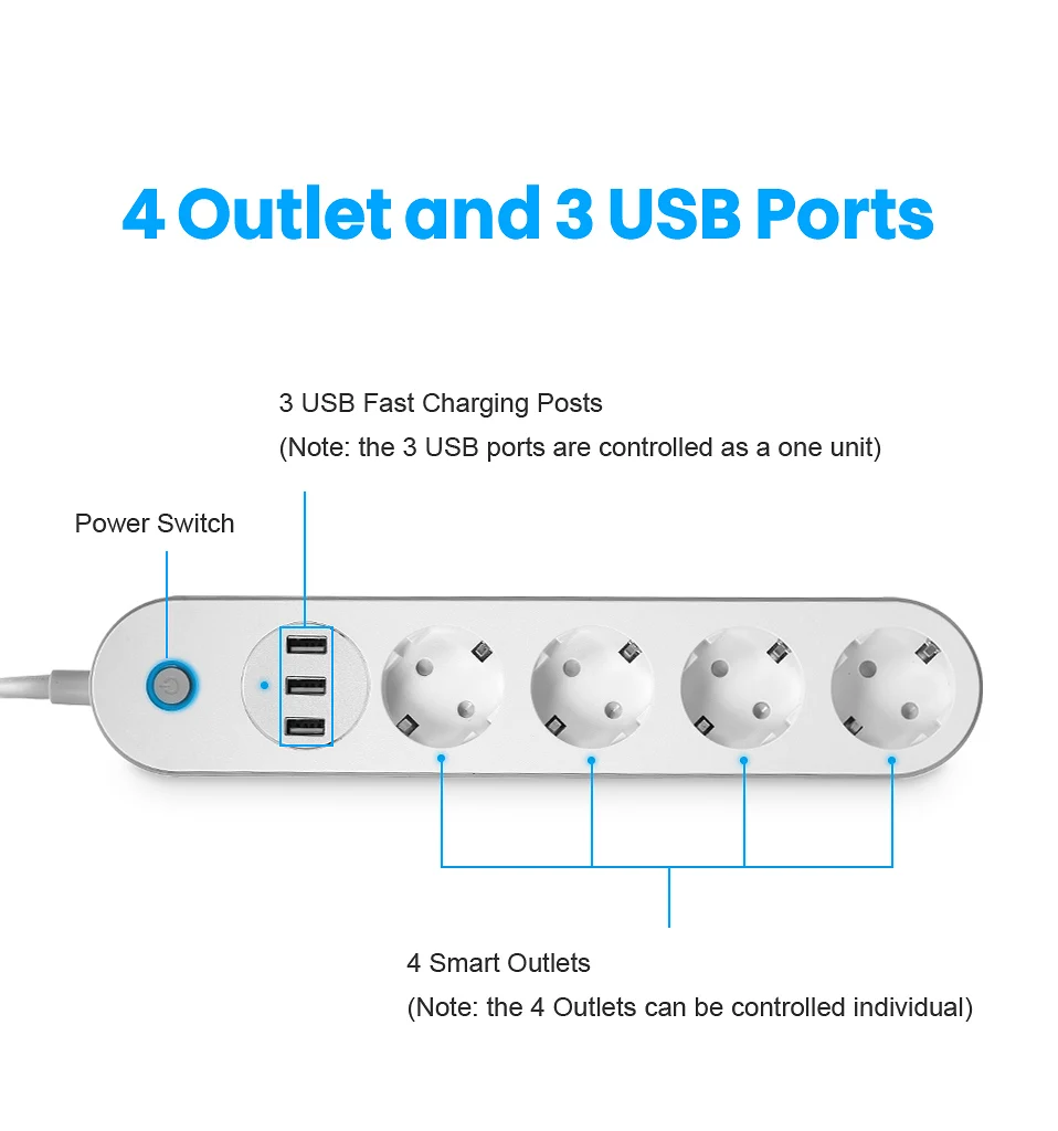 Умный удлинитель с поддержкой Wi-Fi, 4 розетки, 3 USB-порта для зар...
