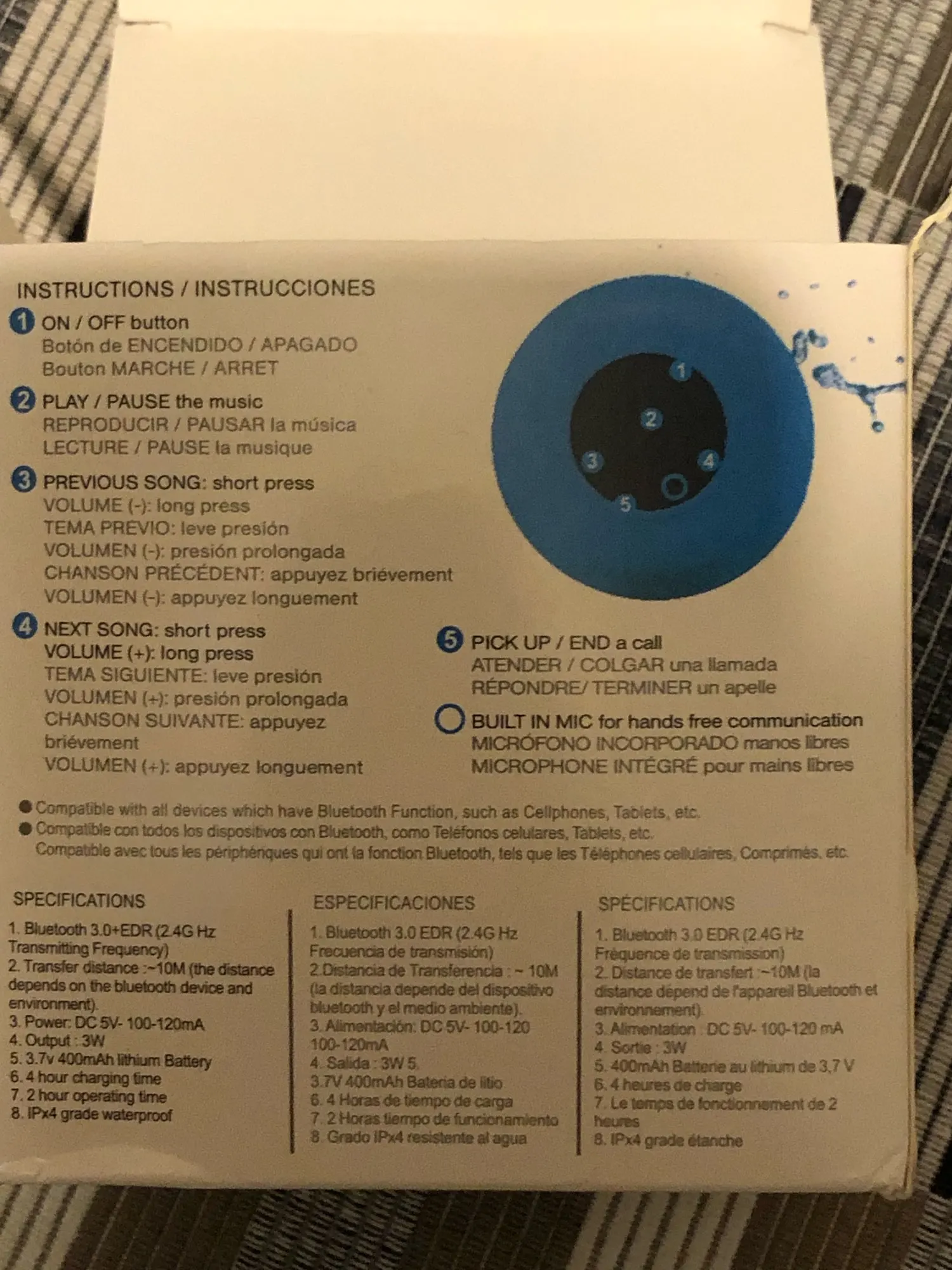 Все пришло целым, спасибо. Покупала 11.11 за 337 руб. На фото выглядит как колонка силиконовая, на самом деле пластмассовая. На фото красивее колонка. На стене на плитке у меня плохо держится, падает. Но по Блютус с айфона соединилась сразу, звучание громкое, по время шума воды очень хорошо слышно. На русском языке инструкции нет.
