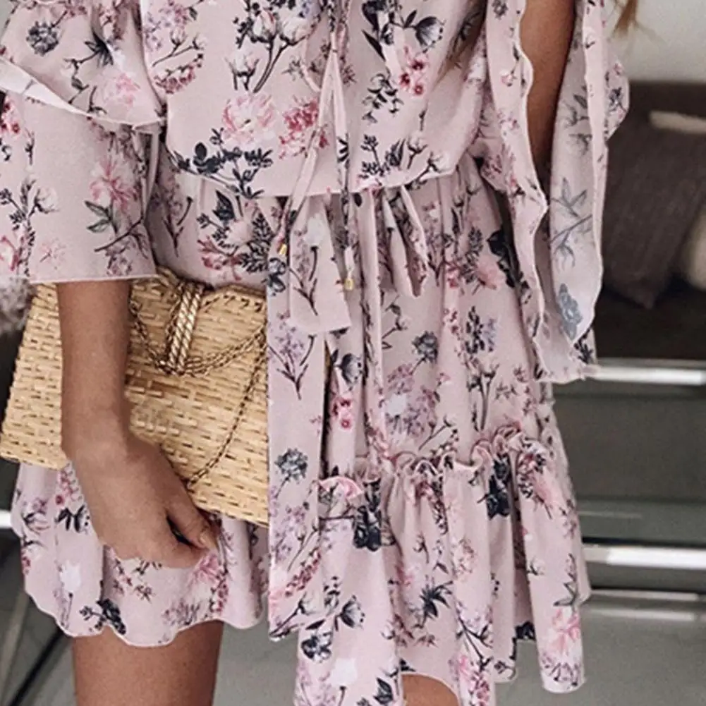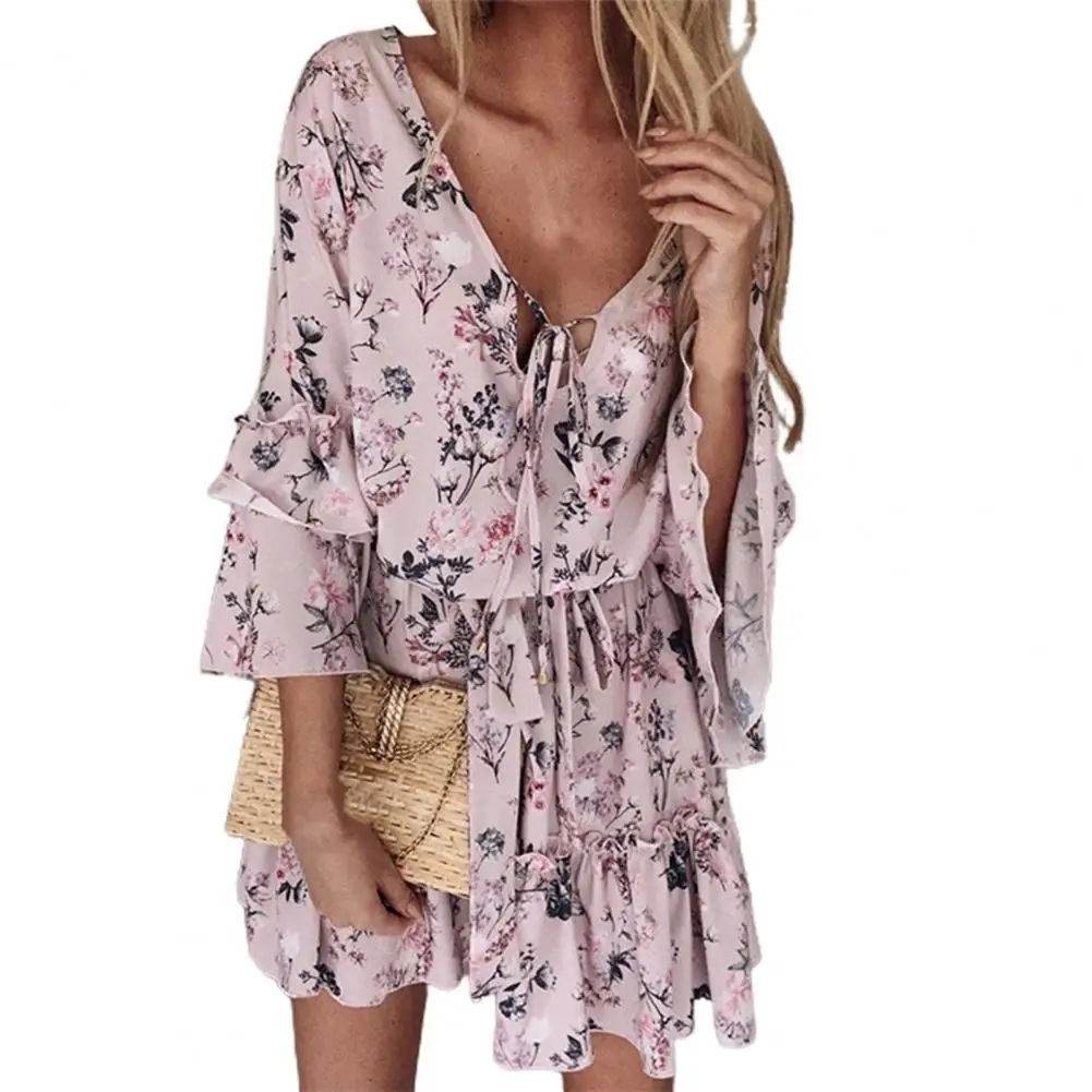 Женское пляжное мини-платье, повседневное свободное платье с V-образным вырезом и коротким рукавом, с цветочным принтом, 2021