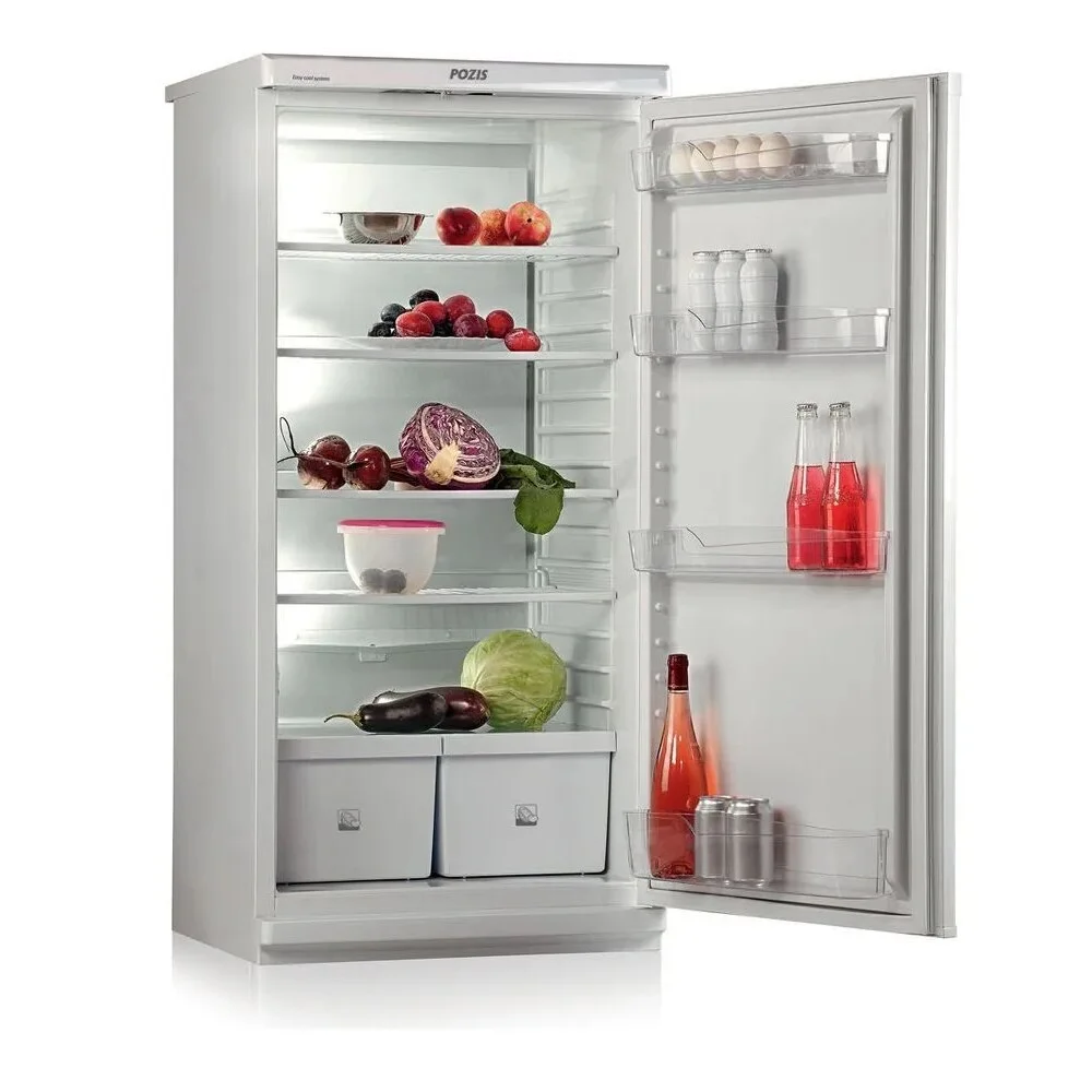 Холодильник POZIS 513-5 в нем нет морозильной камеры, зато объем холодильной позволяет разместить до 222 л продуктов. Для удобства размещения в нем есть 5 полок, которые сделаны из стекла и металлической решетки и выдерживают они довольно большой вес, 2 удобных ящика, а также 4 полки на дверце. Температуру он поддерживает в диапазоне от 0 до 10 градусов при помощи одного стандартного компрессора.Класс энергопотребления А позволяет холодильнику POZIS 513-5 потреблять совсем небольшое количество электричества. Он очень тихий, ведь уровень шума при работе не превышает 40 дБ. Закрывается холодильник при помощи одной двери, которая не позволяет проникать внутрь теплому воздуху. Если вас не устраивает, в какую сторону она открывается, то вы можете ее перевесить.