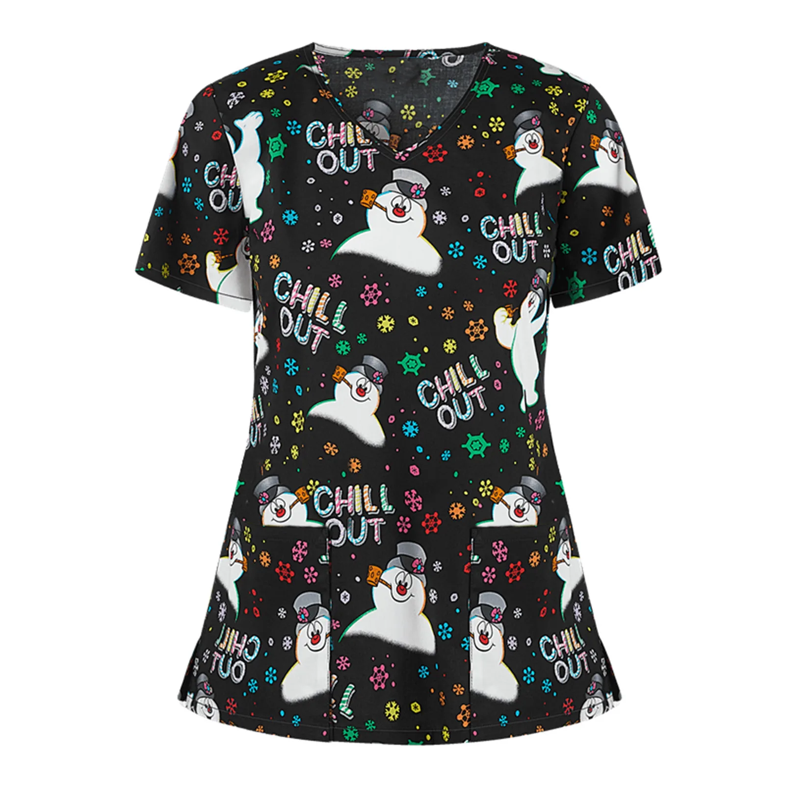 Медицинские скрабы для женщин на Рождество, скрабы с мультяшным принтом, повседневные женские скрабы с коротким рукавом, униформа для медсестры, топы с V-образным вырезом и карманами, блузка