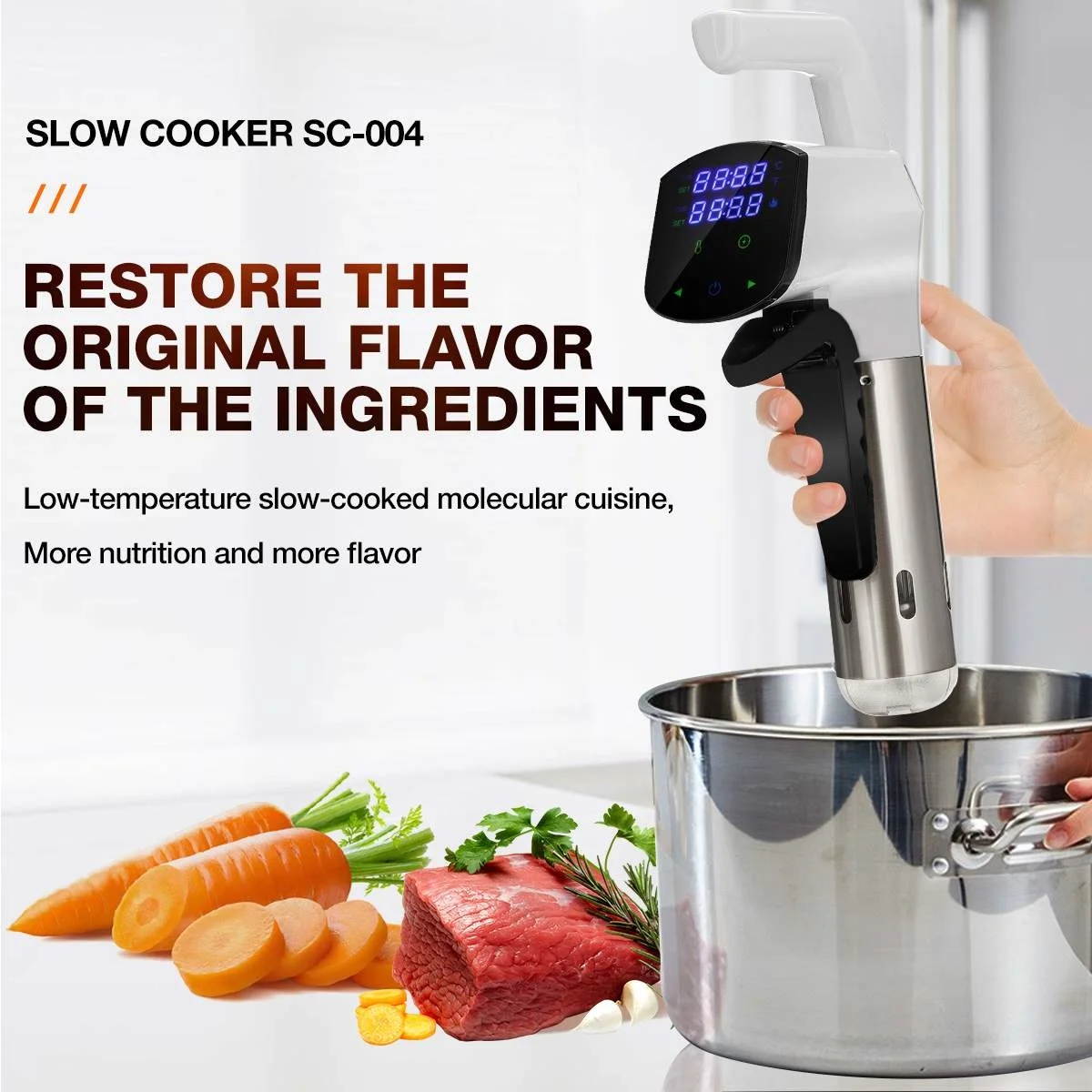 Простота в использовании-Просто прикрепите плиту Sous Vide к кастрюле любого размера с помощью регулируемого зажима, а затем установите время и температуру, нажмите на значок на сенсорном экране, чтобы включить/выключить и подтвердить настройки. Простота в эксплуатации и в течение нескольких секунд.