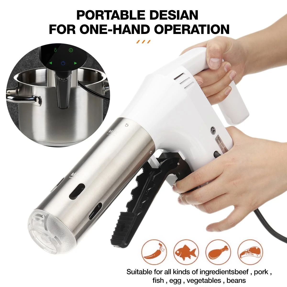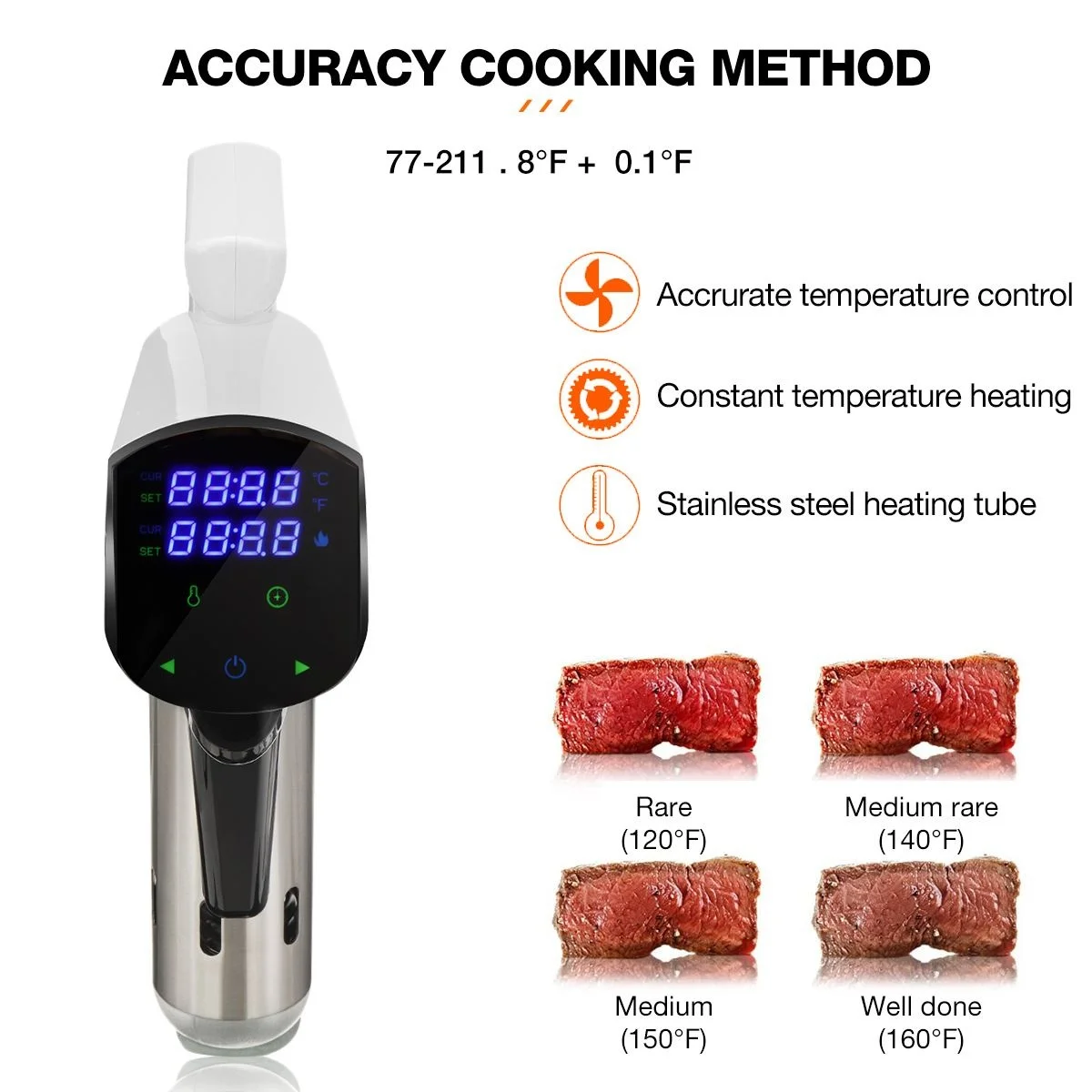 Точное время и контроль температуры-- Большой ЖК-дисплей управления Светодиодный дисплей, hyper-точный контроль температуры (+/-0,1 ℃), цифровой контроль температуры (25-92,5 ℃)(77 °F-198,5 °F) И контроль времени до минут. Приготовление пищи в домашних условиях с sous vide обеспечивает и повышает безопасность пищевых продуктов