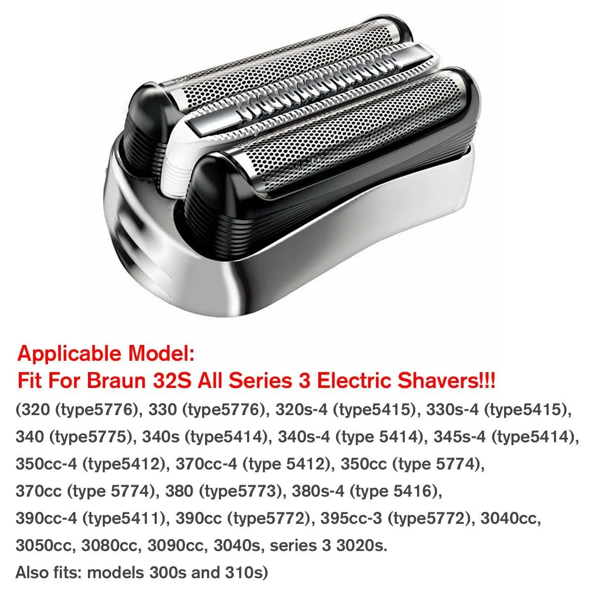 Описание товара:В течение 18 месяцев ваша электробритва будет стригать в среднем 6000000 волосков. Выполняя эту существенную задачу, режущие части будут постепенно изнашиваться, и ваше бритье может стать менее близким и комфортным. Вот почему мы рекомендуем менять фольгу и блок резака вашей бритвы каждые 18 месяцев для поддержания максимальной производительности вашей бритвы. Для эффективного бритья каждый день.Характеристики:Тип: сменная фольгаЦвет: серебристыйСовместимость: подходит для Braun 32S все серии 3 электробритвы!(Для Braun series 3 - 320 (type5776), 330 (type5776), 320s-4 (type5415), 330s-4 (type5415), 340 (type5775), 340s (type5414), 340s-4 (тип 5414), 345s-4 (тип 5414), 350cc-4 (тип 5412), 370cc-4 (тип 5412), 350cc (тип 5774), 370cc (тип 5774), 380 (Тип 5773), 380s-4 (тип 5416), 390cc-4 (тип 5411), 390cc (тип 5772), 395cc-3 (тип 5772), 3040cc, 3050cc, 3080cc, 3090cc, 3040s, серия 3 3020s.Также подходит: модели 300s и 310s)Особенности:-Совместимость со всеми электробритвами серии 3.-Обновите бритье с помощью нового двойного среднего триммера, улучшенного с уникальным титановым покрытием.-Легко заменяйте детали бритвы Braun каждые 18 месяцев для поддержания максимальной производительности.-Небольшие инвестиции. Большая разница!Посылка включает в себя:1 сменная фольгаПримечание: наш продукт содержит только фольгу для бритвы, а не резак для бритвы.