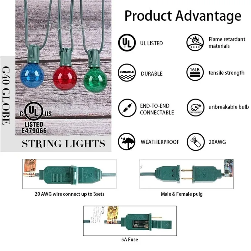Гирлянда G40 25 футов с круглыми лампочками для внутреннего дворика, рождественская лампа-лента для двора, бистро, рынка, декор для вечеринки в саду, 25 цветов