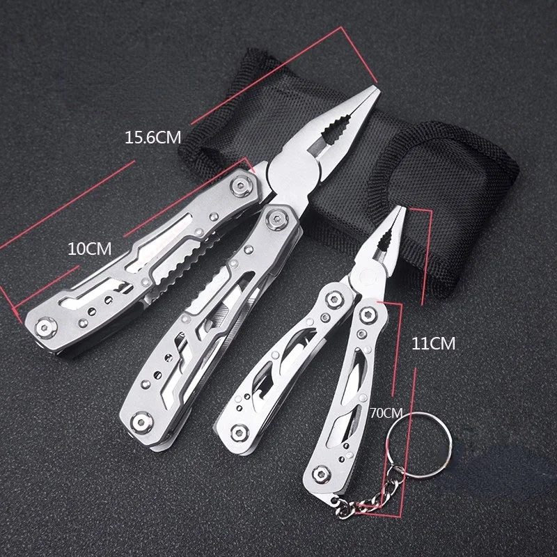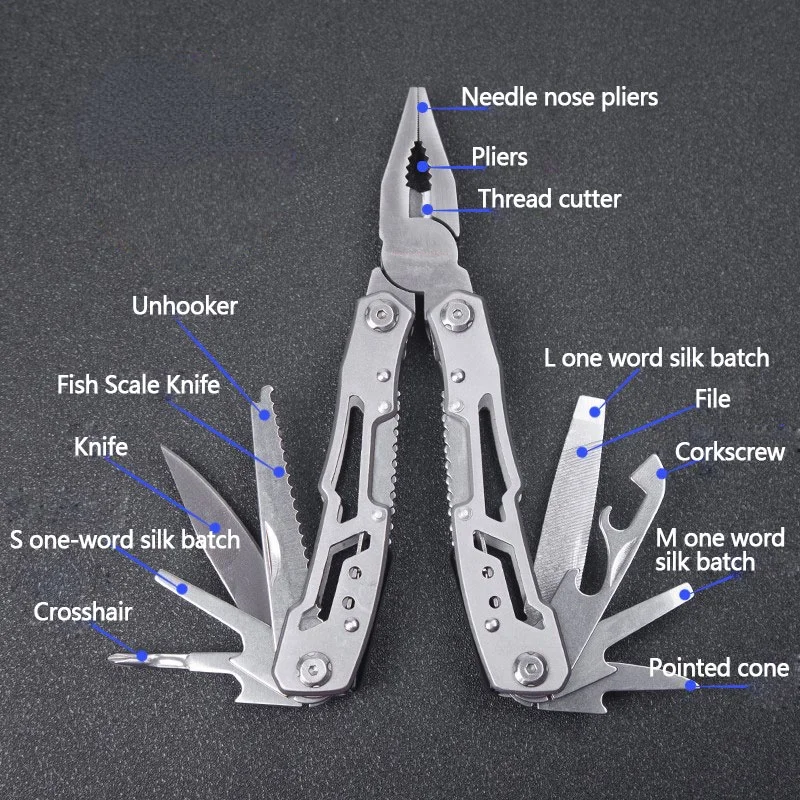 14 в одной функции: 1. Плоскогубцы (плоскогубцы с иголками, плоскогубцы с круглыми трубками, режущие плоскогубцы) 2. Нож 3. Крестовая отвертка 4. Маленькая шлицевая отвертка 5. Нож для рыбьей чешуи 6. Деташер 7. Двухсторонняя пилка 8. Большая шлицевая отвертка 9. Скребок 10. Средняя шлицевая отвертка 11. Консервный нож 12. Открывалка для бутылок