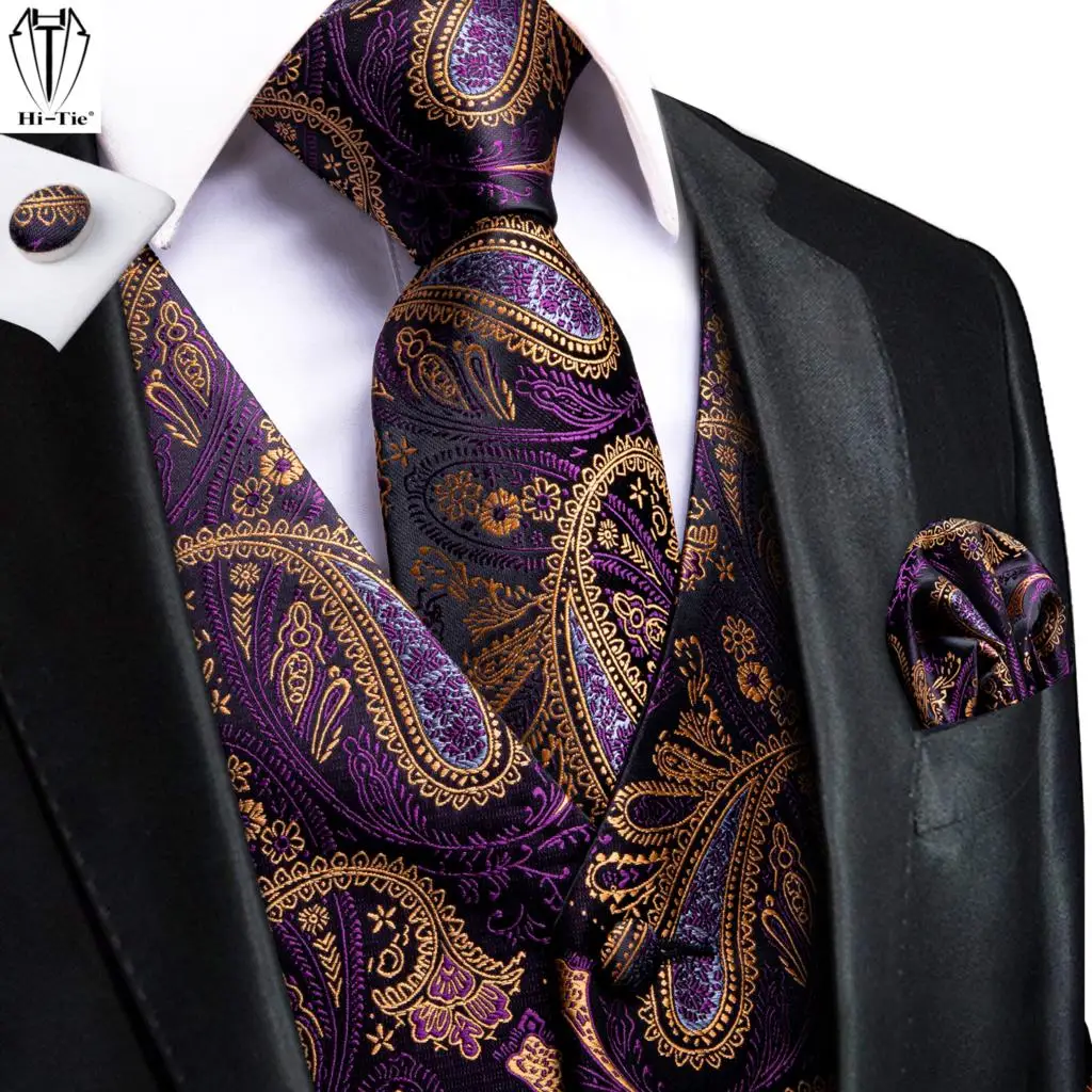 Привет-галстук 100% шелк фиолетовый золотой Пейсли мужские жилеты с шеей Галстук платок Запонки Набор жаккардовый жилет для свадебного бизнеса