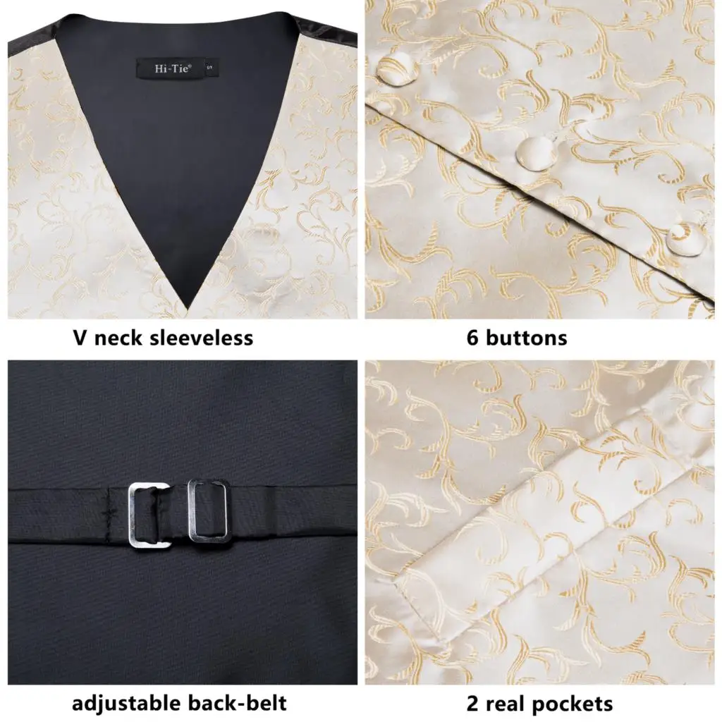Hi-Tie, 100% шелк, цвета слоновой кости, бежевый, шампанского, золотой, мужские жилеты, галстук, платок, запонки, набор, жаккардовый жилет, жилет для мужчин, костюм, платье