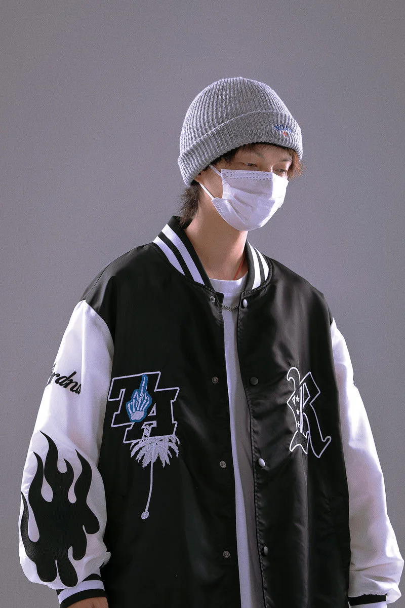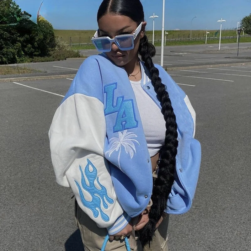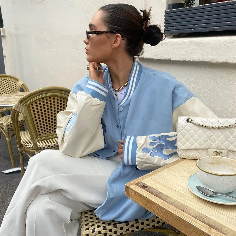 Куртка-бомбер свободного кроя FSDA, модель сезона осень-зима 2021 года, синяя бейсбольная куртка-бомбер с вышивкой в стиле ретро