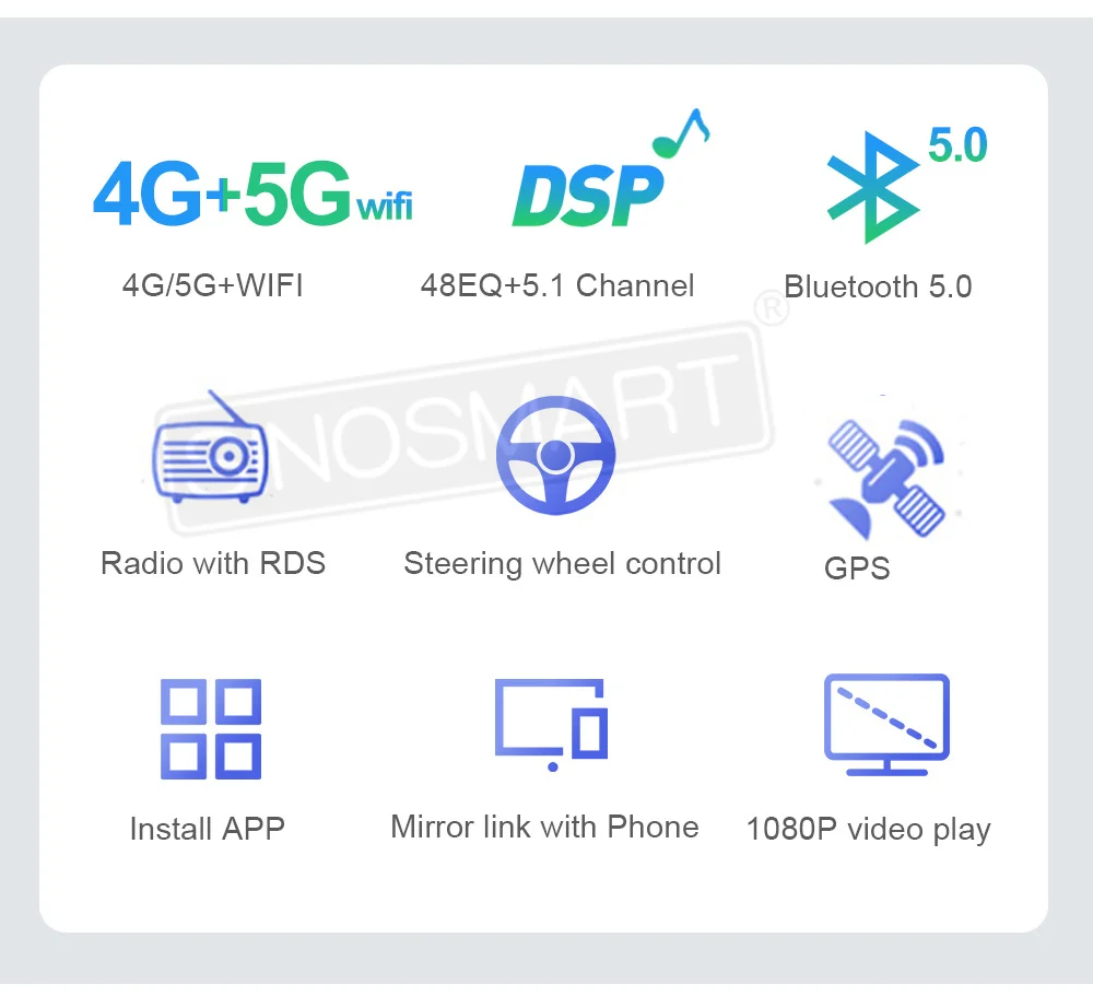 Встроенный GPS, радио с RDS, поддержка кнопок управления рулем, Bluetooth для телефонных звонков/музыки и Bluetooth OBD,TPMS,1080P видео воспроизведения, зеркальная связь с телефоном. Загрузите и установите приложение, которое вам нравится.