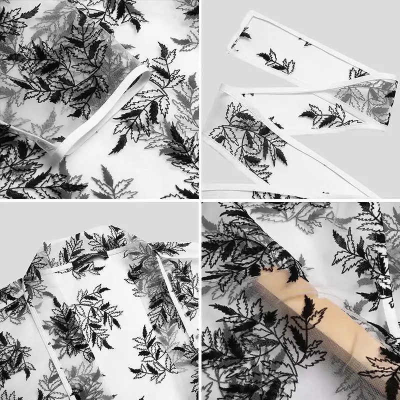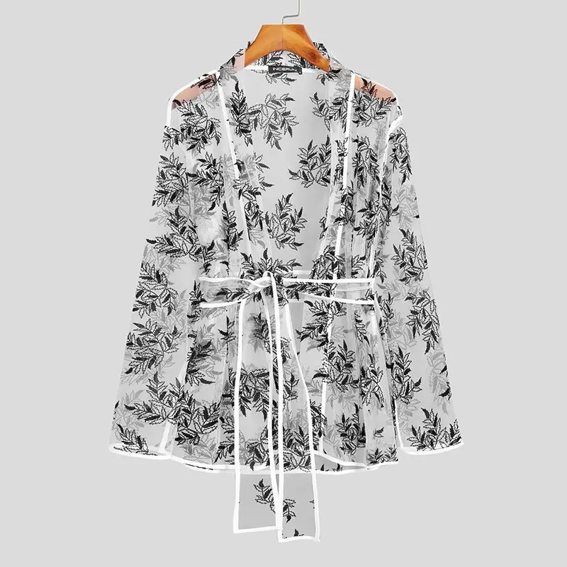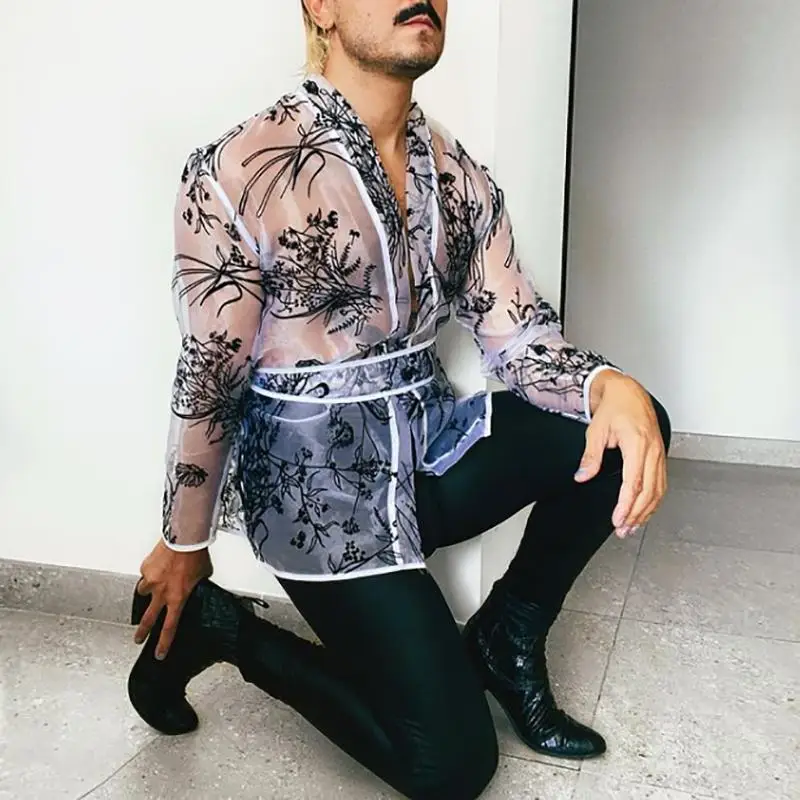Мужская сетчатая прозрачная рубашка с длинным рукавом и поясом, 2022