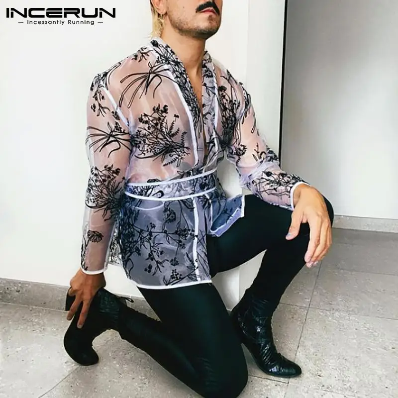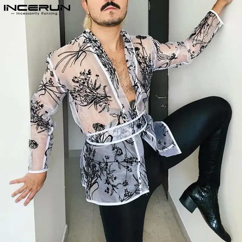 Топы INCERUN, новинка 2022, Мужская пикантная свободная прозрачная блузка с длинным рукавом и принтом, повседневный удобный кардиган, женская рубашка