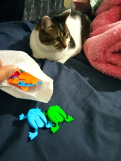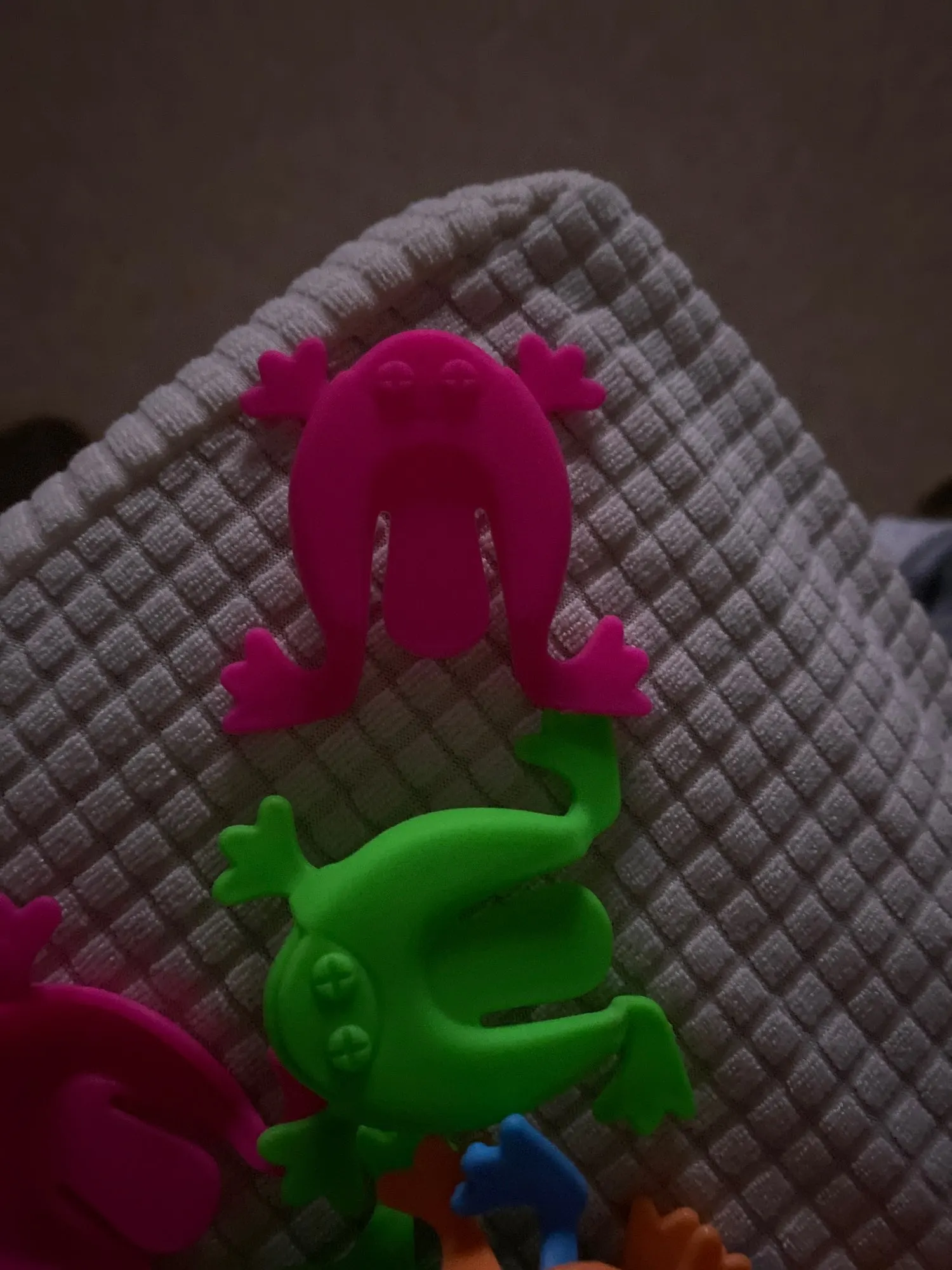 Они маловаты по размеру. У нас уже были лягушки. Надеялась дополнить. Пришли разных цветов, включая какую-то розовую. Прыгают. Но я думала чуть иное получить