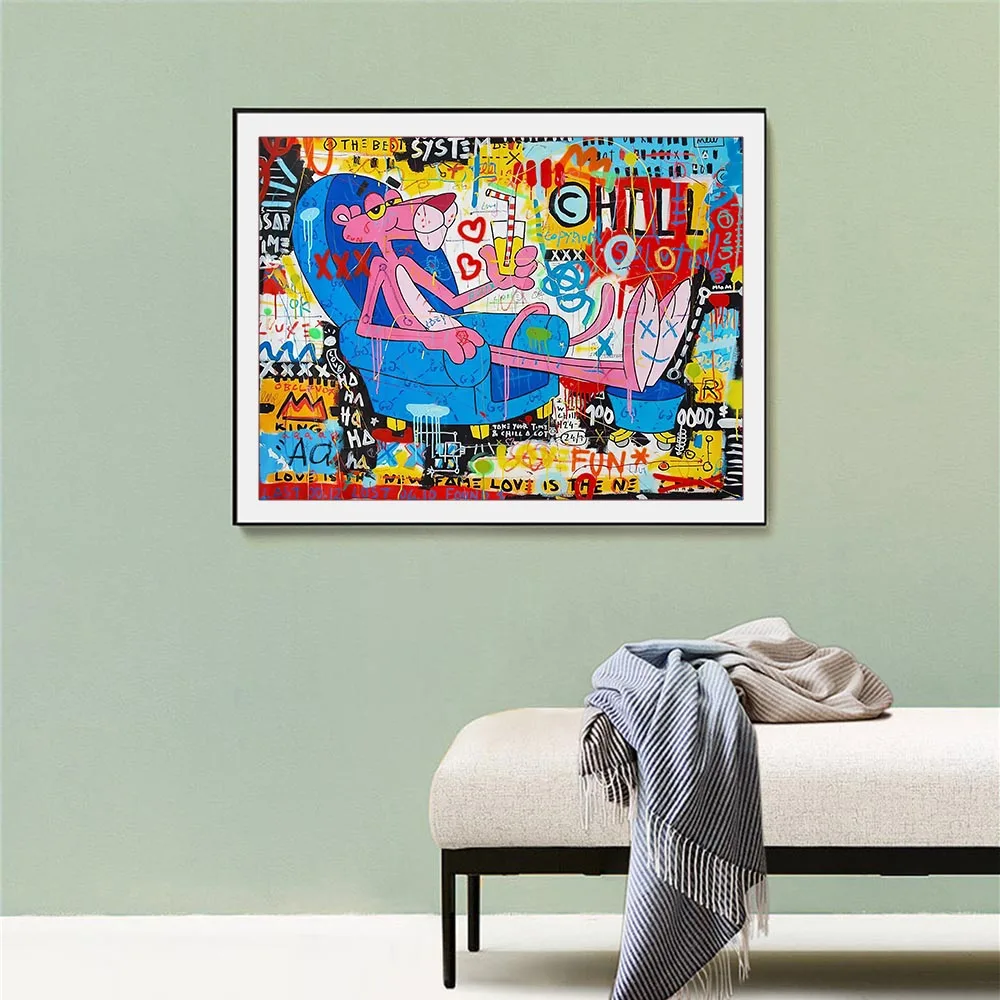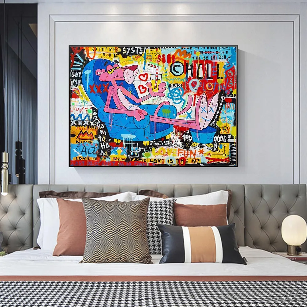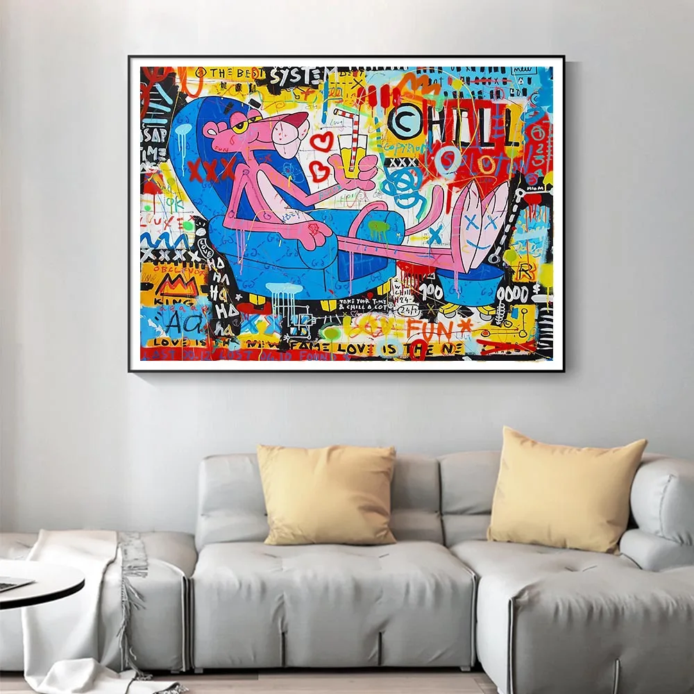 Розовая пантера, лежащая на диване, расслабляющие постеры и принты, современное искусство в стиле поп-стрит, фотообои для украшения дома