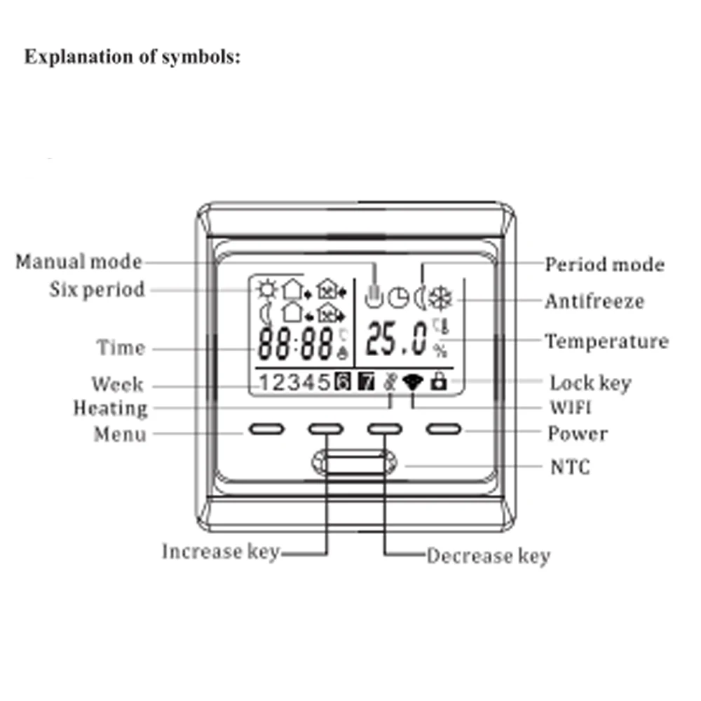 1) Еженедельный программируемый: может установить 5 + 2 шесть периодов, удобный, удобный и экономичный.2) Блокировка для детей: во избежание неправильного использования детьми.