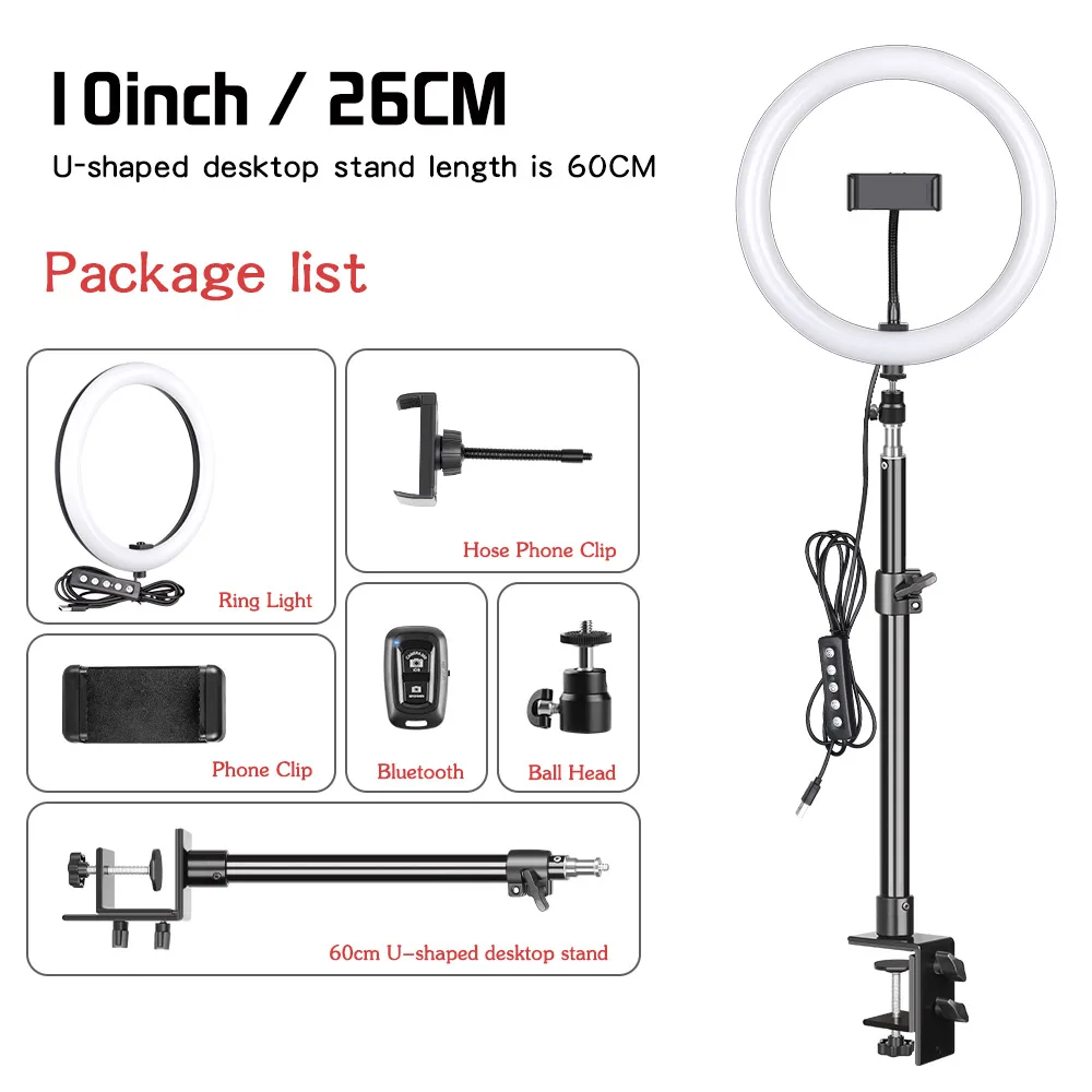 1*60 см u-образная настольная подставка1*10 дюймов кольцевой светильник1 * Bluetooth1 * горячий башмак1 * зажим для телефона1 * зажим для телефона1 * USB кабель питания