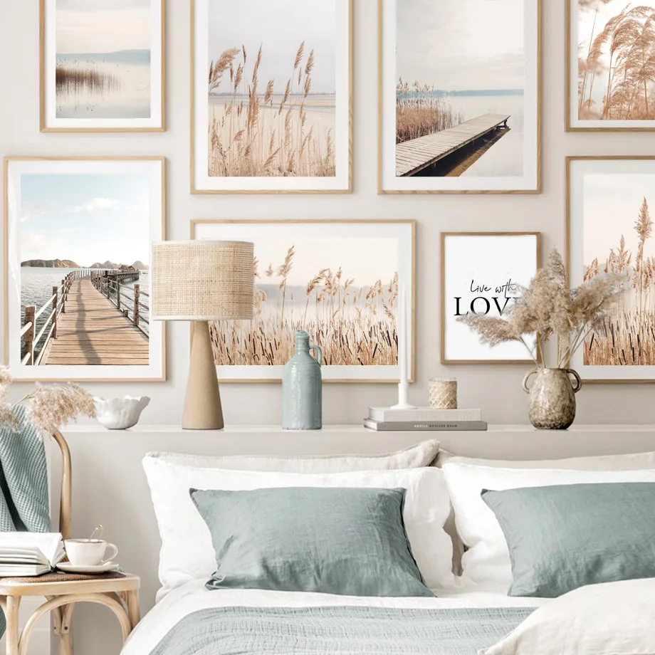 Бежевое озеро завод деревянный мост осень скандинавский пейзаж настенная живопись холст постеры и принты Декор интерьера гостиной