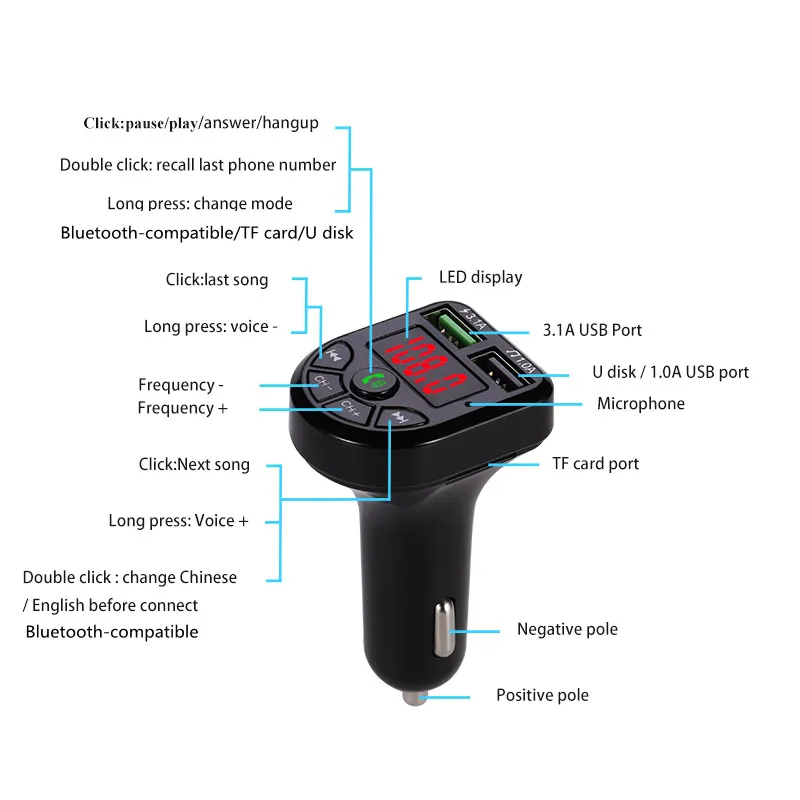 Светодиодный fm-передатчик, Bluetooth, совместимый с 5,0 автомобильным комплектом, двойное автомобильное зарядное устройство USB 3.1A 1A, 2 порта, USB, MP3 музыкальный плеер для iphone, поддержка автомобиля, u-диск, Tf карта