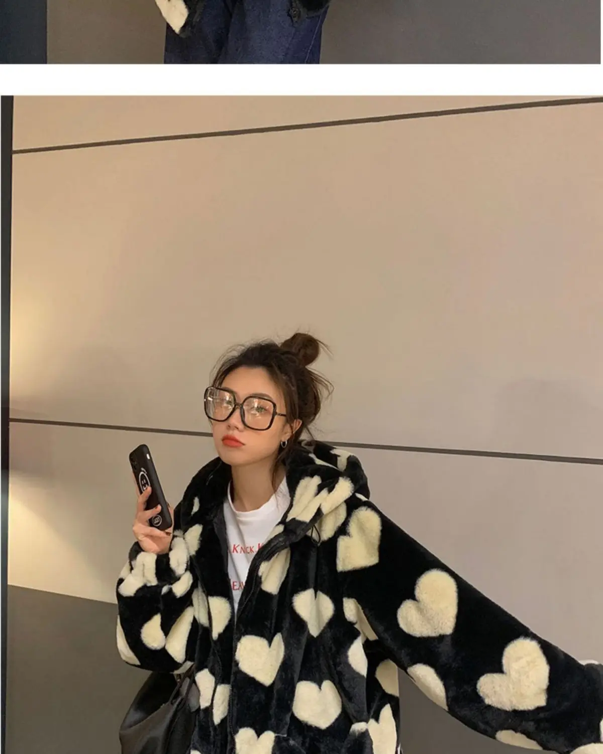 Новинка Осень-зима 2021 Женская плюшевая куртка с имитацией меха кролика женское свободное зимнее пальто с капюшоном и подкладкой с принтом сердца для женщин