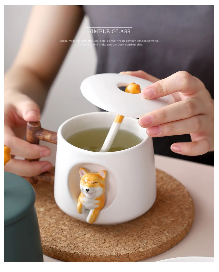 Мультяшная керамическая кружка 3D Сиба-ину, кофейная чайная чашка, искусственная кожа с крышкой и ложкой, набор керамических кофейных чашек для молочного чая, 420 мл