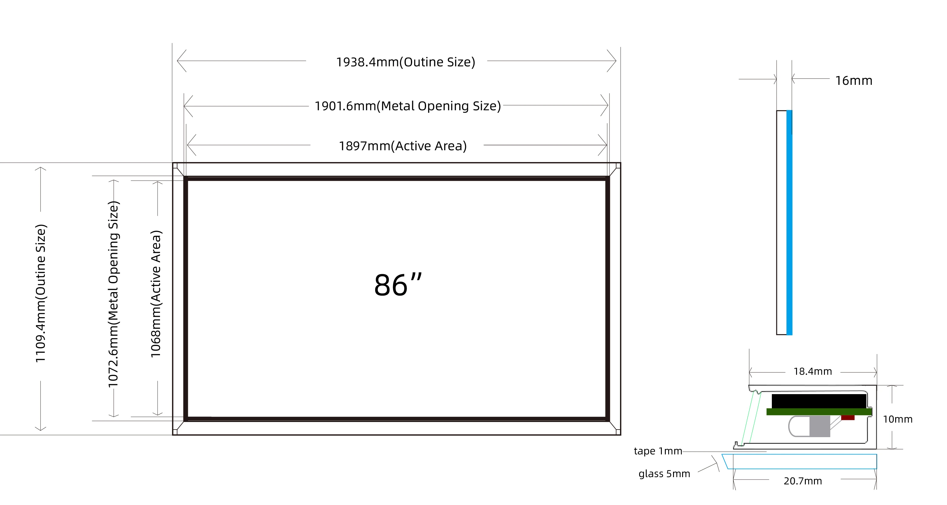 Ультратонкий, ультраузкий дизайн, независимо от того, внешний он или встроенный, может адаптироваться к различным потребностям, не влияя на внешний вид и не экономя встроенного пространства. Принцип инфракрасного обнаружения, простая отделка СВЕТОДИОДНЫЙ светодиодная матрица, стабильная производительность, высокая точность прикосновения и долгий срок службы. Уникальный способ установки упрощает установку клиента.