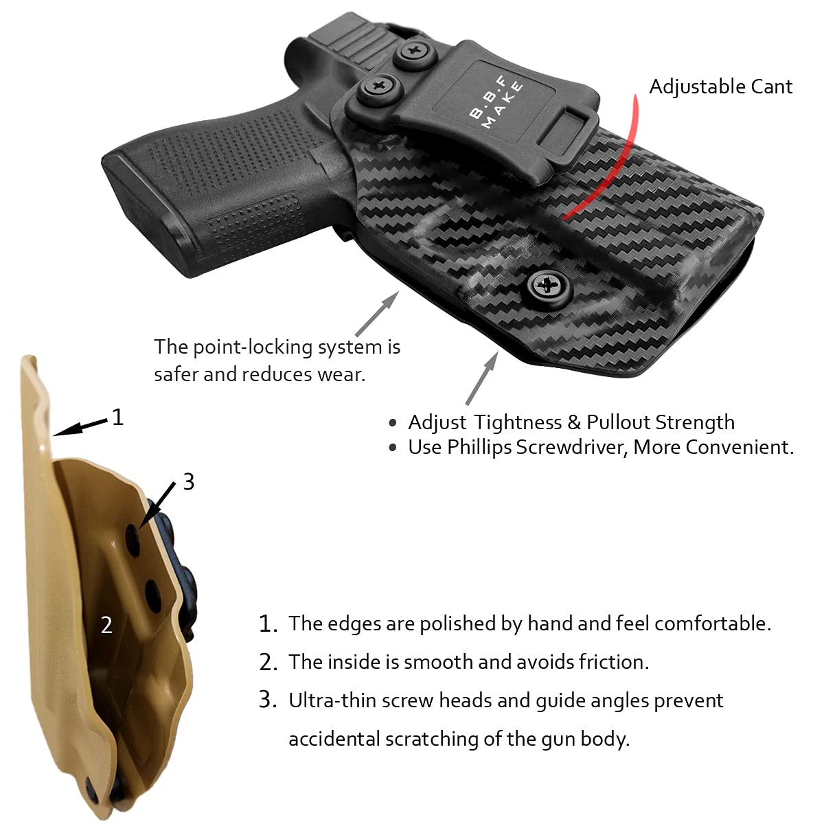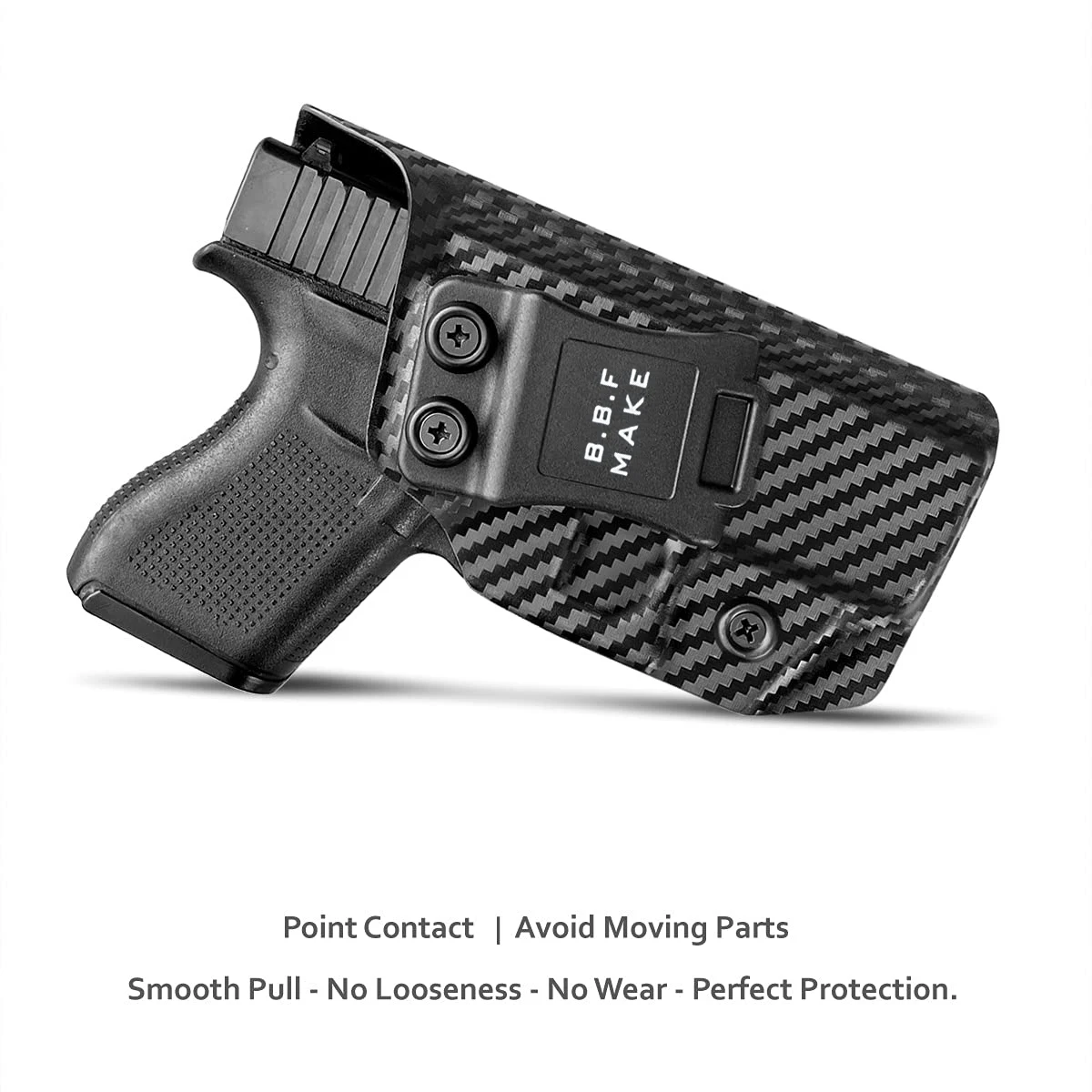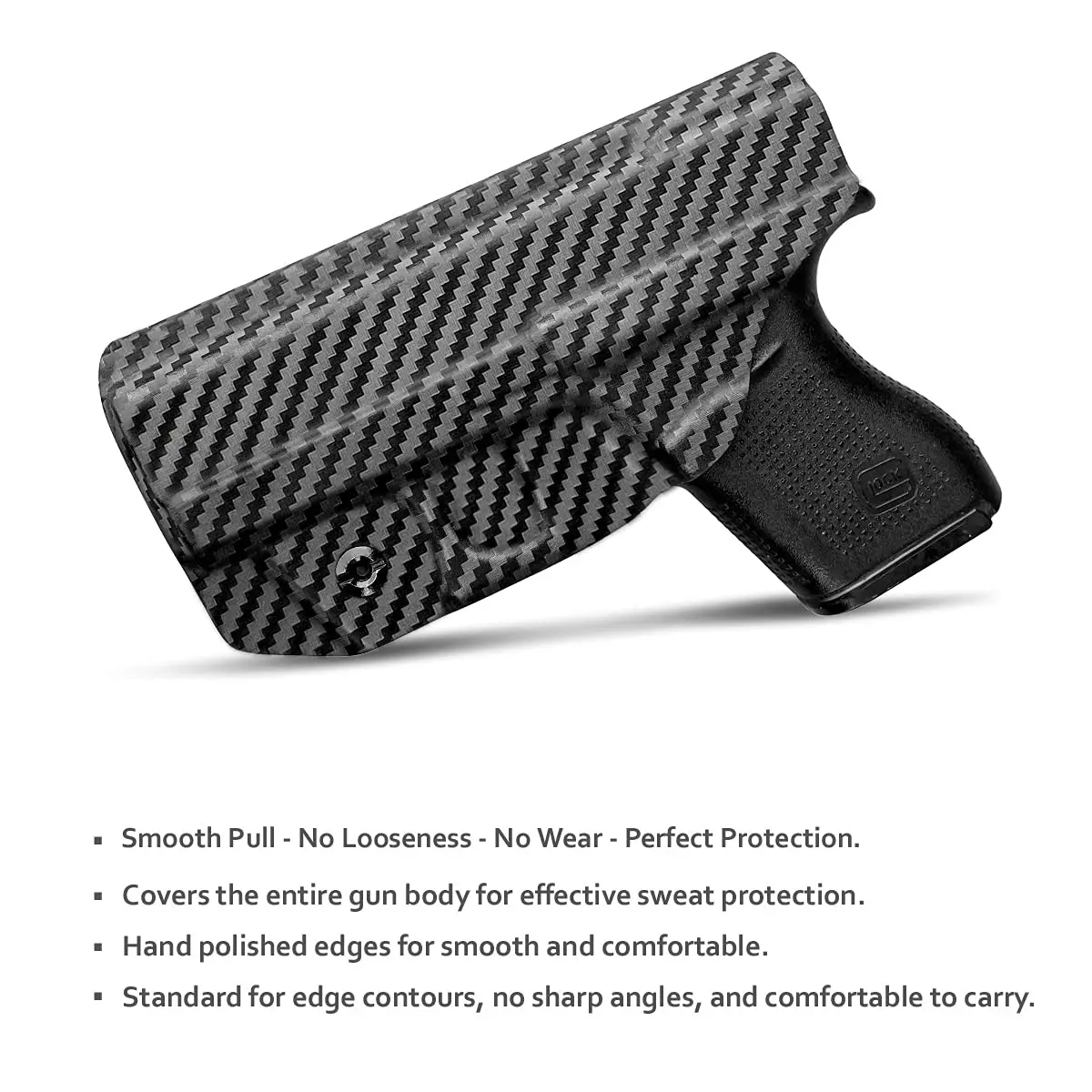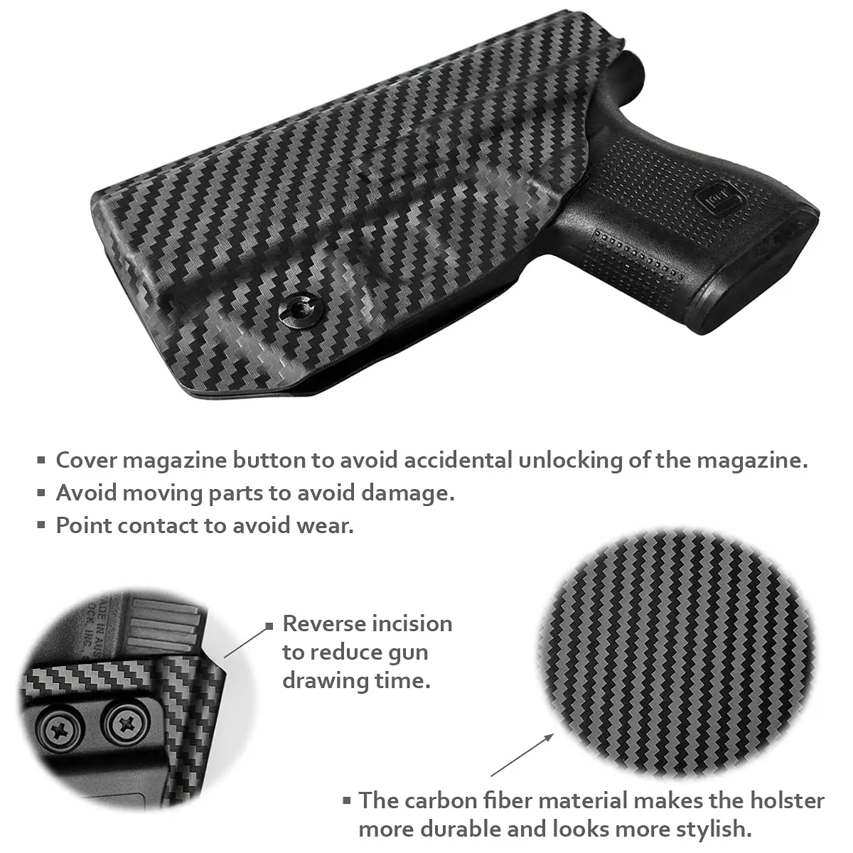 US .08 ”углеродное волокно KYDEX ручной работы: легкий, прочный, прочный, влагозащищенный и моющийся, обеспечивает комфорт и уверенность в любой ситуации. Кобура Glock 43 охватывает весь корпус, эффективно предотвращая пот и избегая зажимов, можно безопасно и безопасно использовать.