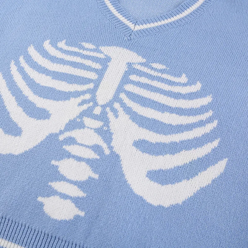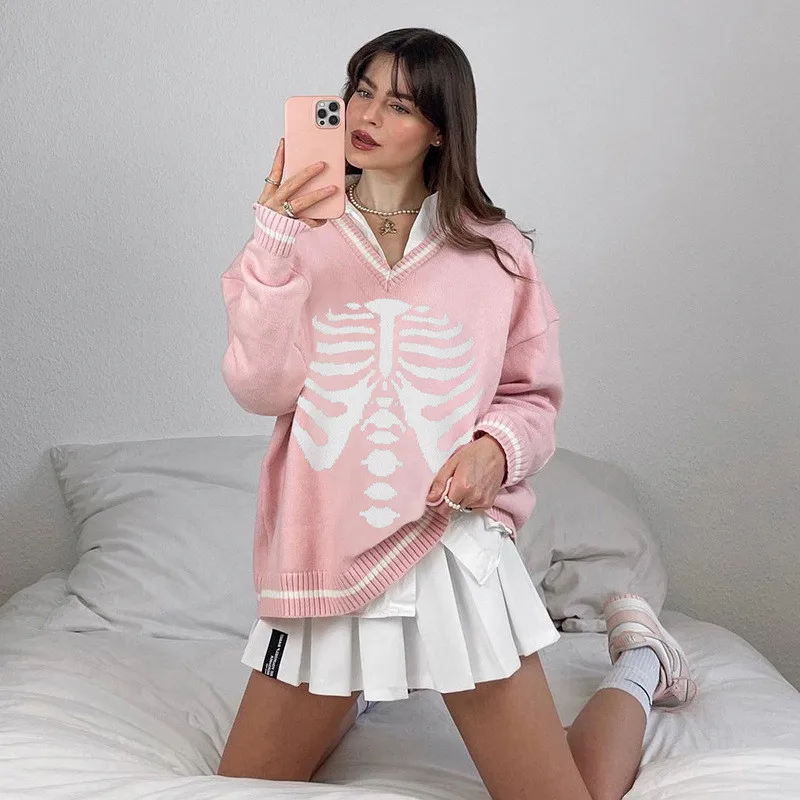 Женский трикотажный свитер со скелетом, Свободный Повседневный трикотажный пуловер в стиле ретро с V-образным вырезом, Осень-зима, Y2K
