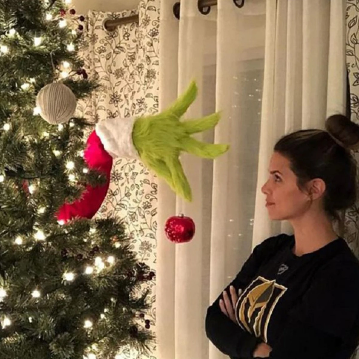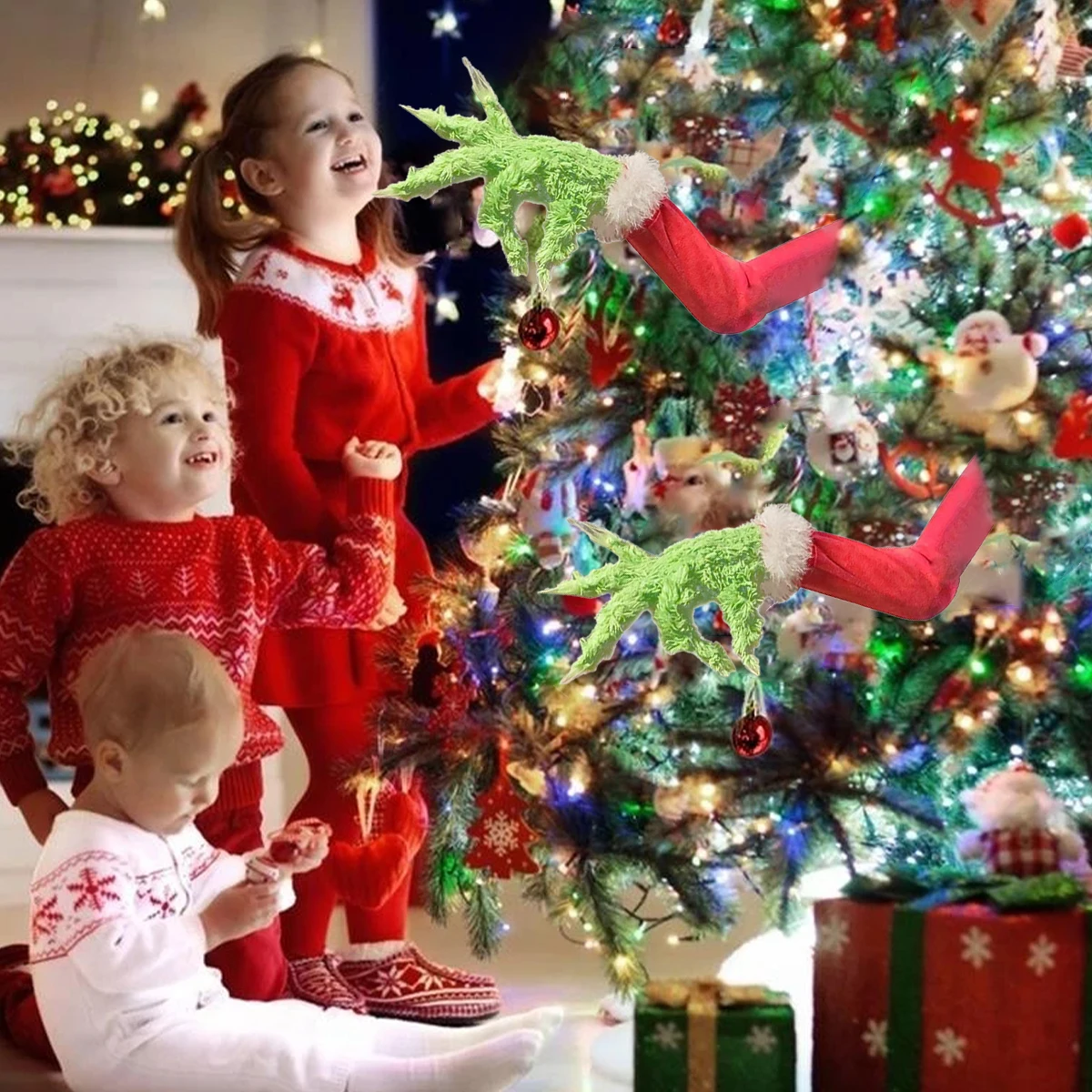[Уникальный дизайн] при установке зеленой руки и головы на рождественскую елку вы обнаружите, что зеленый меховой Монстр появляется с рождественской елки, держа красный шар в руке, показывает вам плохую улыбку.
