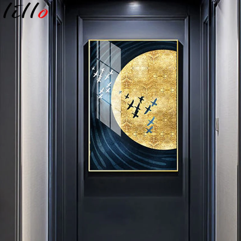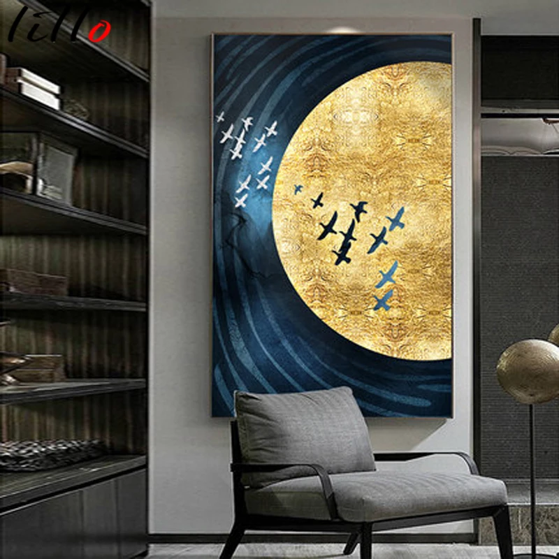 Декоративная картина с изображением голубого звездного неба, золотая луна, Абстрактные Художественные дизайнерские картины для гостиной, коридора