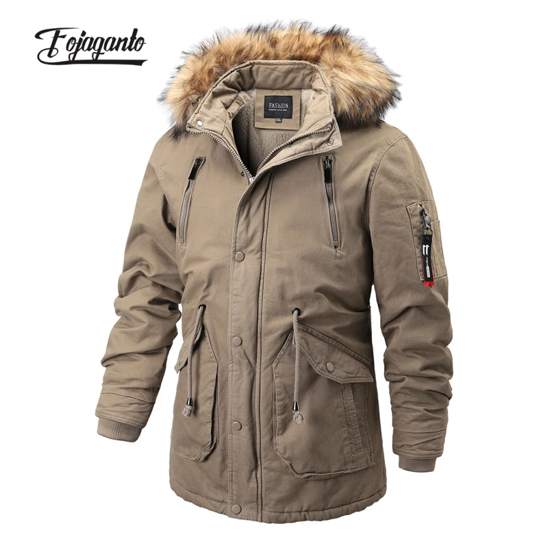 FOJAGANTO мужское зимнее хлопковое пальто средней длины толстые однотонные парки в британском стиле с меховым воротником повседневное теплое пальто с принтом для мужчин