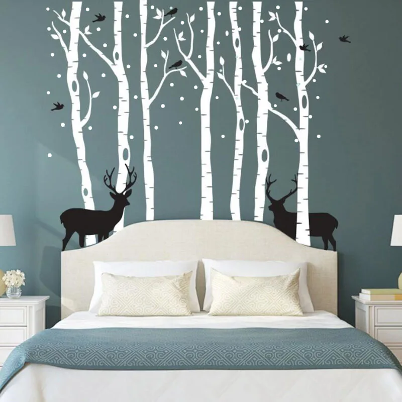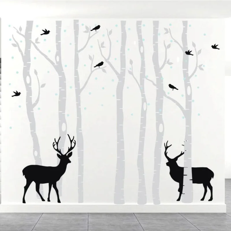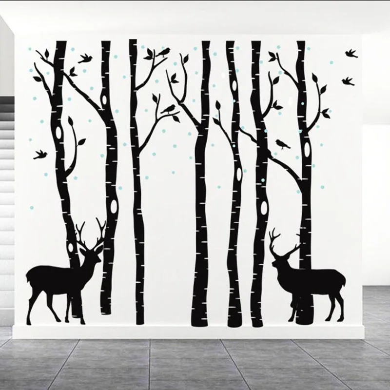 Березовые деревья с оленем и птицами, настенные Стикеры, большие ветки, снежные деревья, домашний декор, диван, фотообои B937