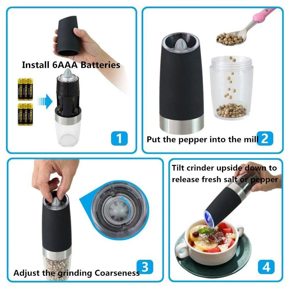 Установите батарею, установите ингредиенты, отрегулируйте толщину и автоматически переключитесь при наклоне, он будет автоматически измельчать, и светильник включится