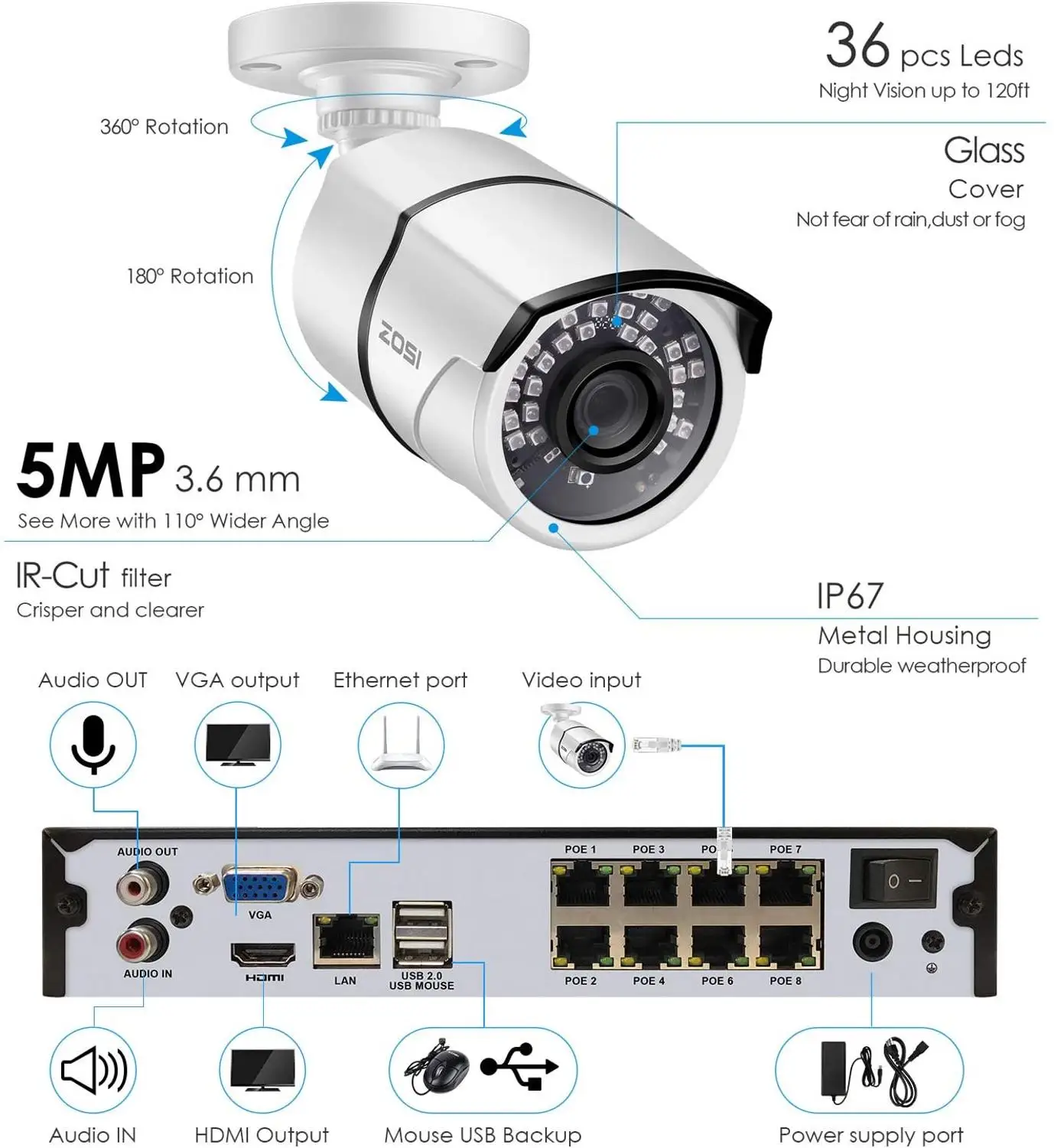 Система видеонаблюдения ZOSI H.265 +, 8 каналов, 5 МП, POE, 4 Х5 Мп, HD IP-камера, наружная водонепроницаемая система видеонаблюдения, комплект видеорегистратора для дома