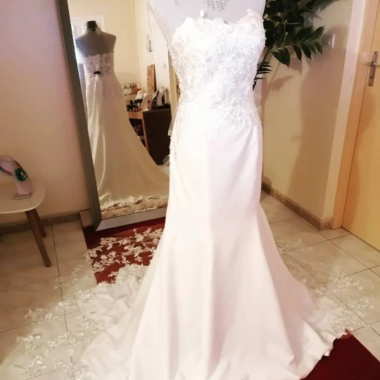 Платье свадебное атласное без бретелек со шлейфом и аппликацией