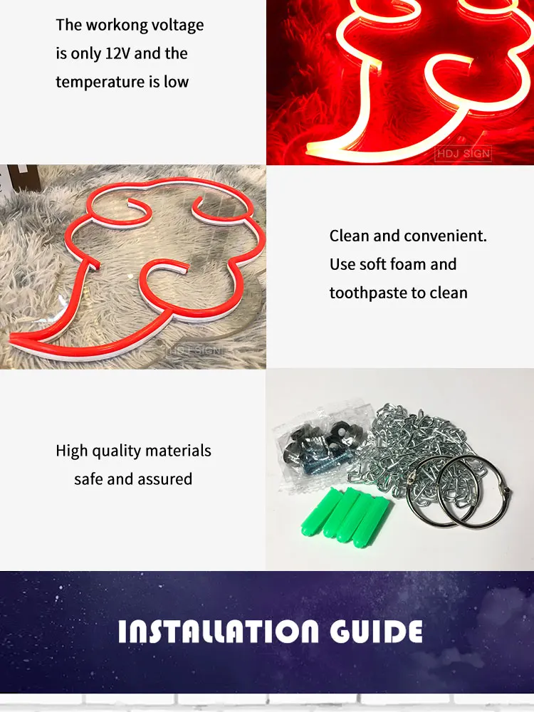 1. Акрил: обладает хорошей прочностью, светильник весом, долговечностью, не легко повредить, прозрачные материалы делают неоновый светильник s более красивым