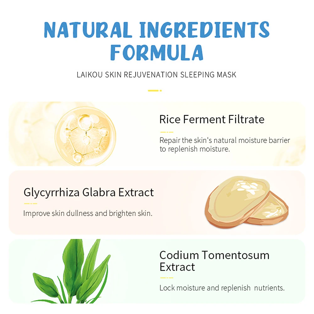 Содержащий фильтрат рисового брожения и экстракт глициррхизы глабра, маска для омоложения кожи LAIKOU может восстановить естественный барьер влаги кожи для пополнения влаги, успокоить кожу и осветить тон кожи. С водянистой и прозрачной текстурой он восстанавливает и омолаживает кожу в ночное время. Длительное использование делает кожу нежной, гладкой и мягкой.