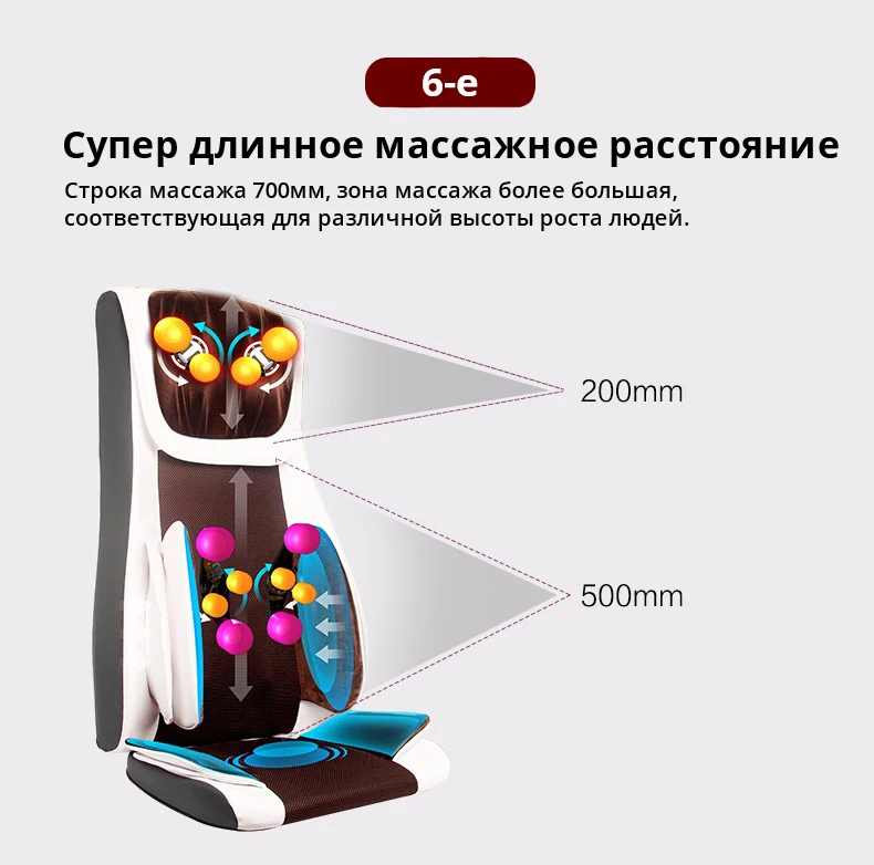 1. Шея: четыре теплых массажных головки вперед и назад вращающиеся разминаются более жестким и мягким способом2. Задняя часть: s-тип интеллектуального механизма руки движущиеся вверх и вниз, ширина массажа регулируется3. Талия и ягодицы: подушка безопасности с обеих сторон, высокая частота вибрации на сиденье4. Методы массажа: Туина, разминание, шиацу Методы массажа комбинация работы на полной спине5. Горячая компрессия шеи, спины и талии6. Четыре режима опционально: 1. Полная обратная съемка, 2. Верхняя часть спины движется, 3. Нижняя часть спины движется, 4. Массаж с фиксированной точкой